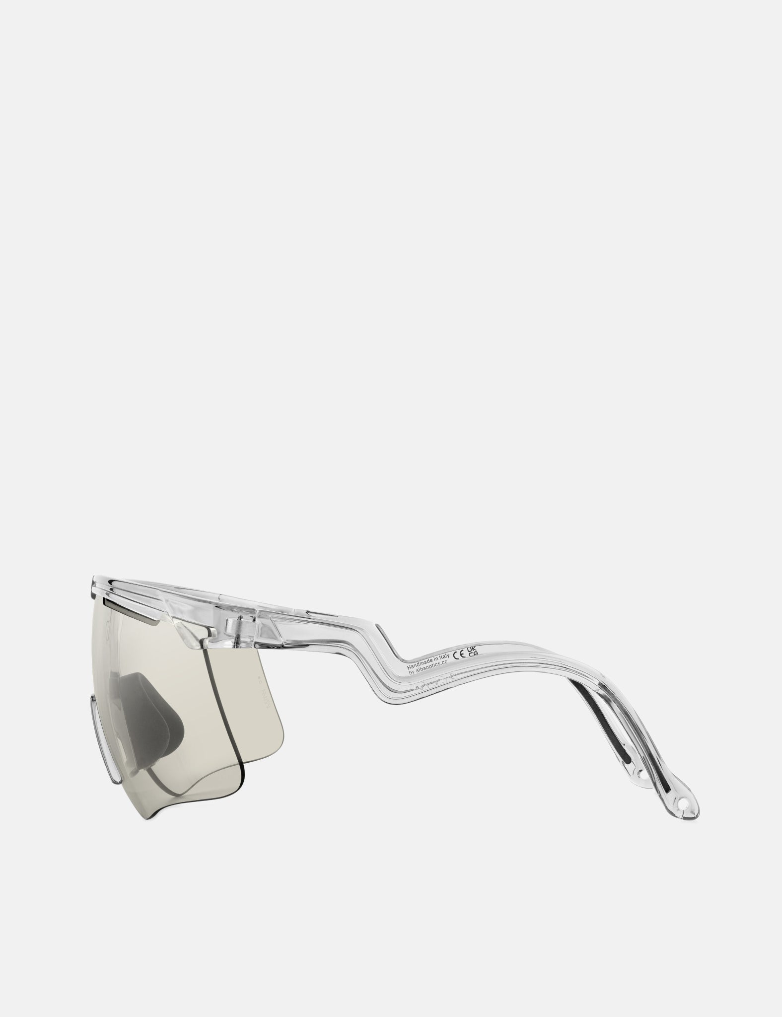 Get ready to turn heads with the Alba Optics Delta Sunglasses in crystal clear frame, featuring VZUM ALU tinted photochromatic lenses.