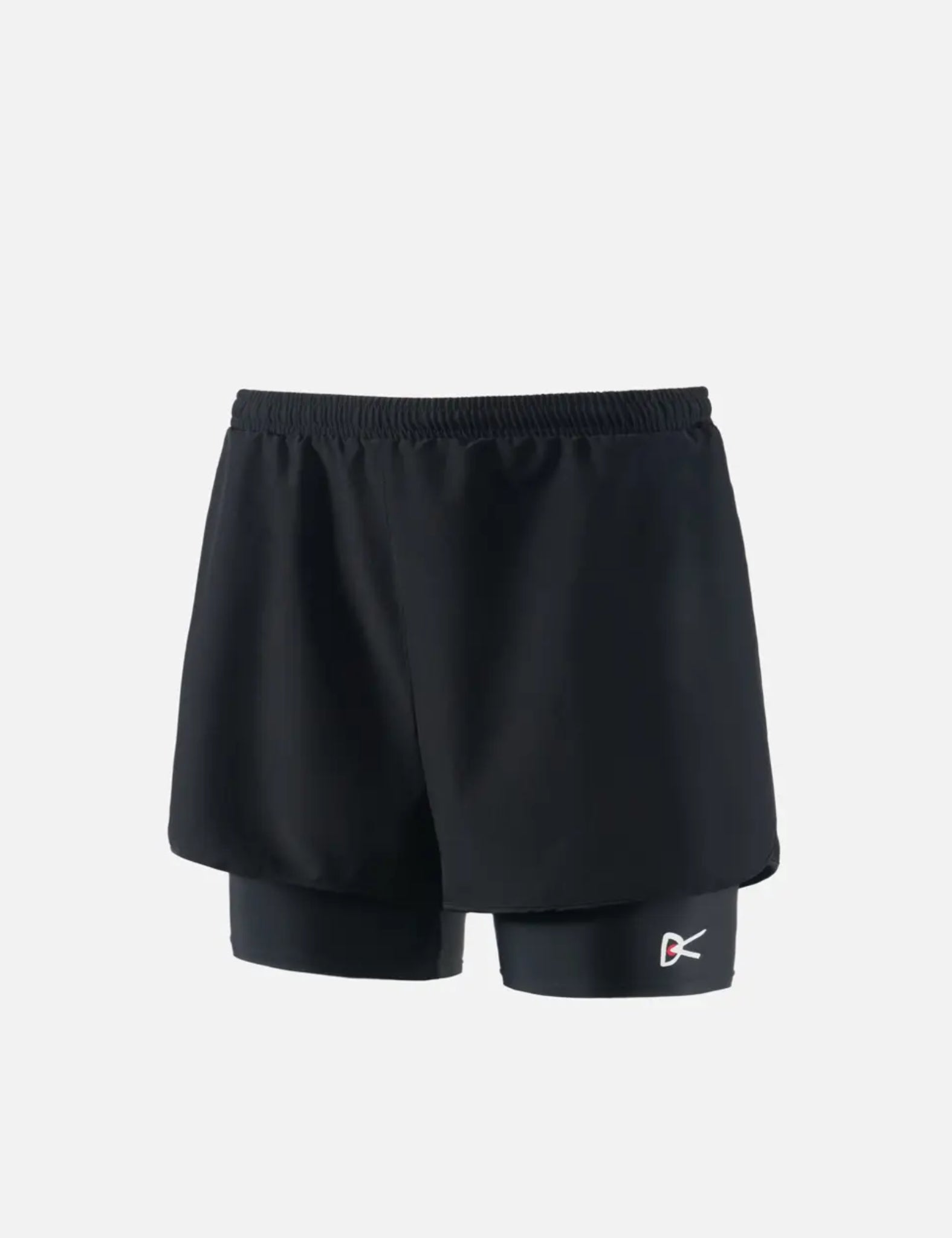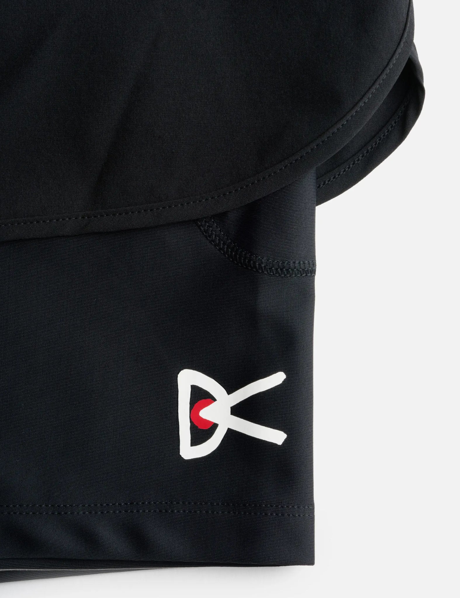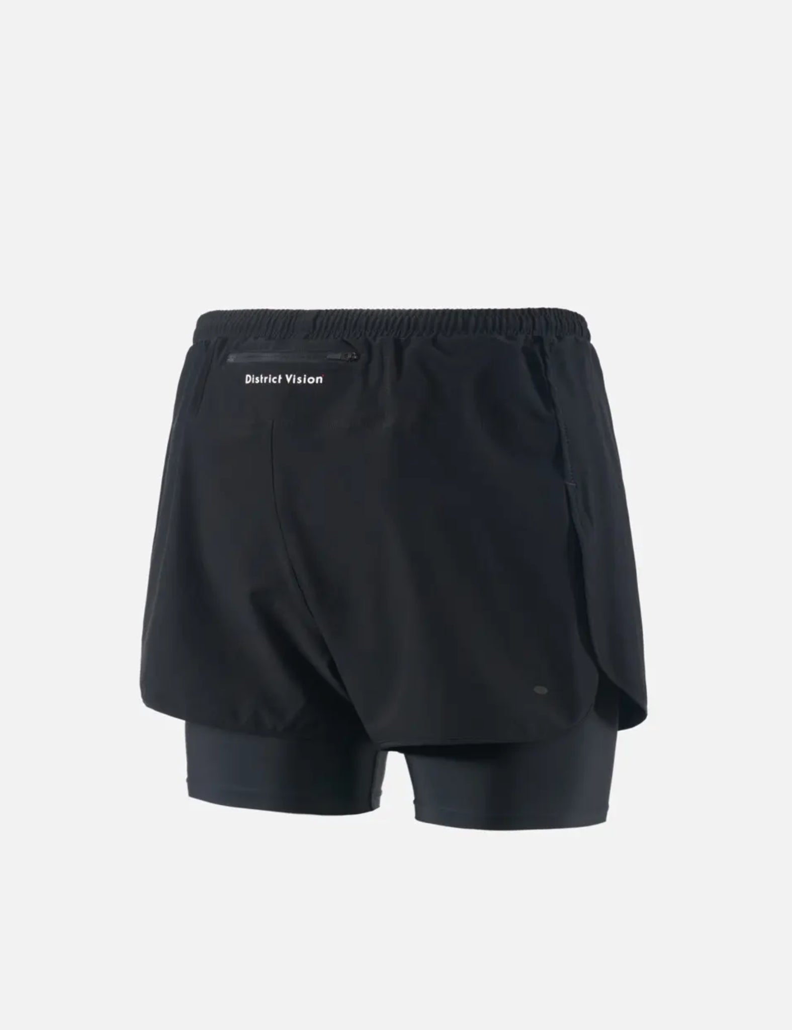 Introducing the District Vision Women's Layered Trail Shorts in sleek black. This innovative design combines DV's eco-friendly recycled half tights with 3” split shorts.