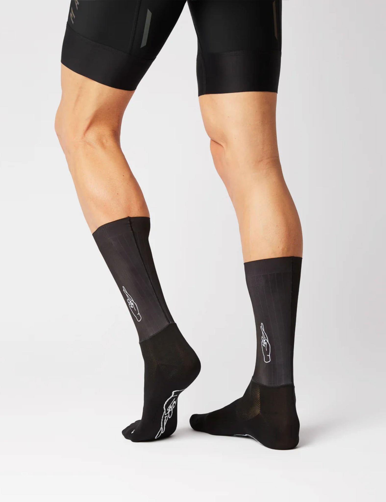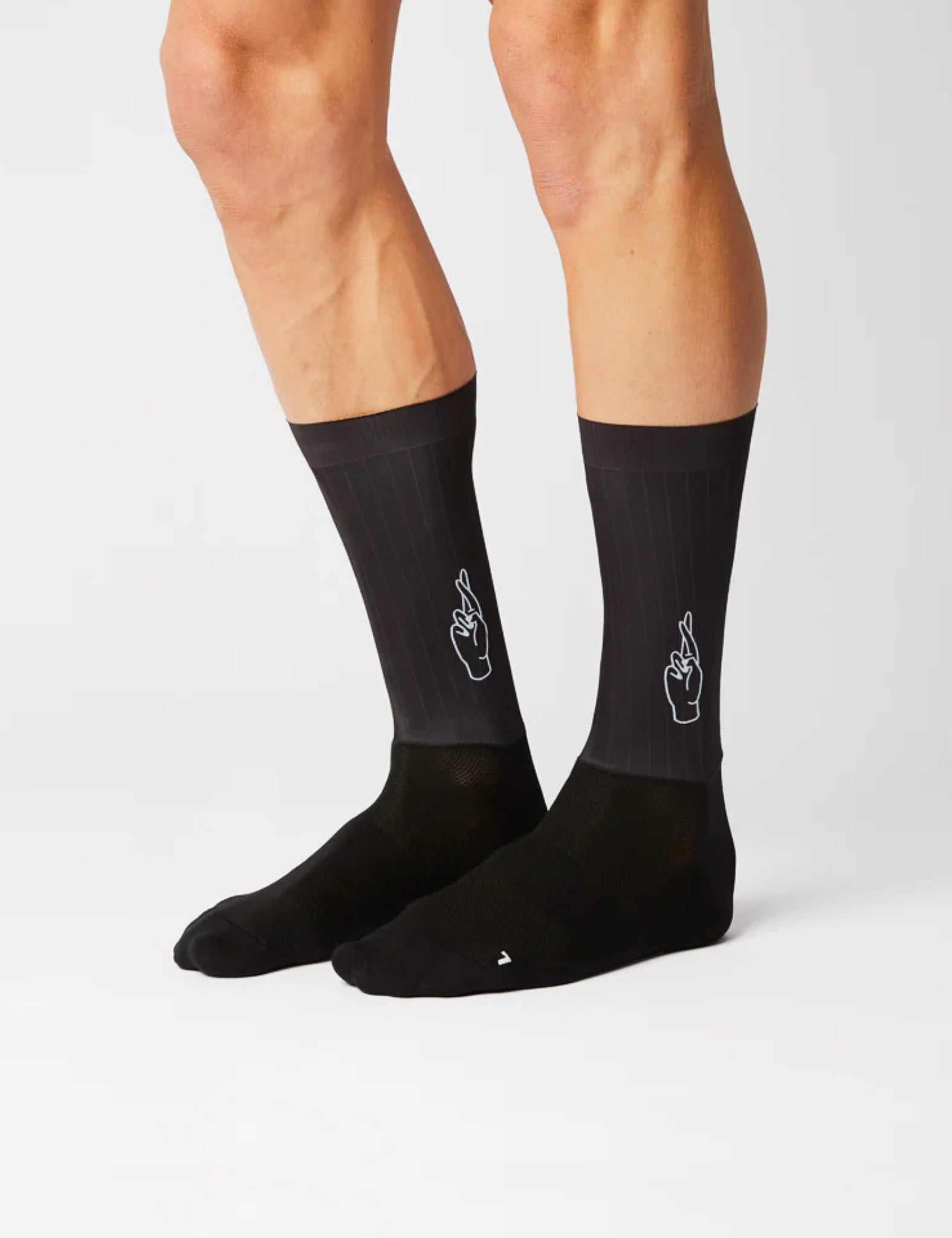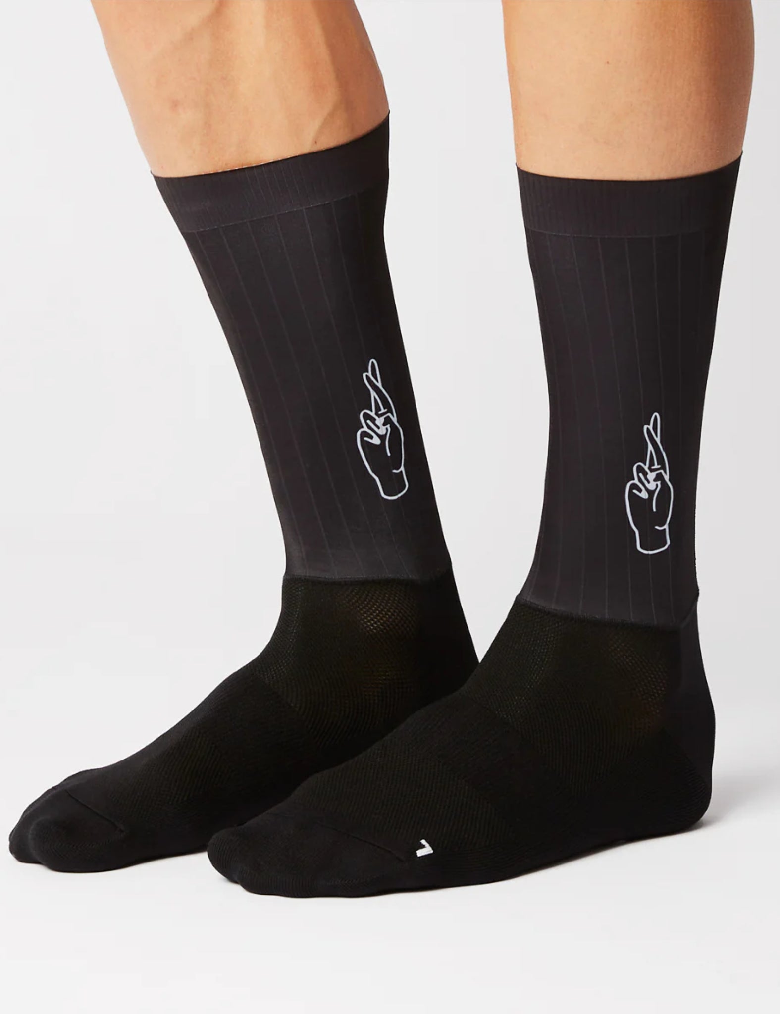 Introducing the Fingers Crossed Rolling Aero Logo Socks in black - the perfect blend of nylon and elastane for ultimate speed.