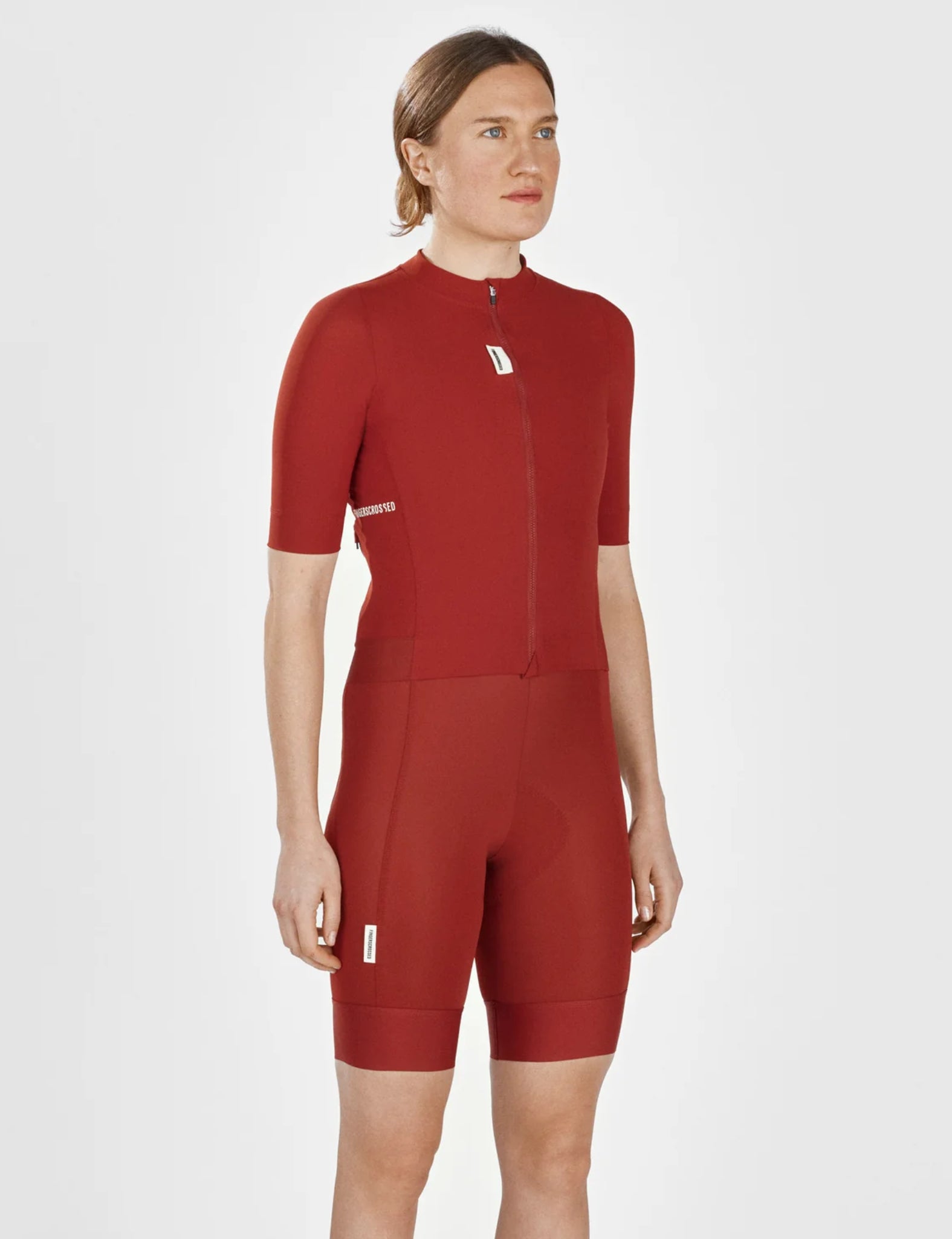 Introducing the Women's Fingers Crossed Road Jersey in brick red. For those longer days and sunnier skies, this jersey has got you covered. It's the go-to pick every year, with top-notch quality and an effortlessly cool design.