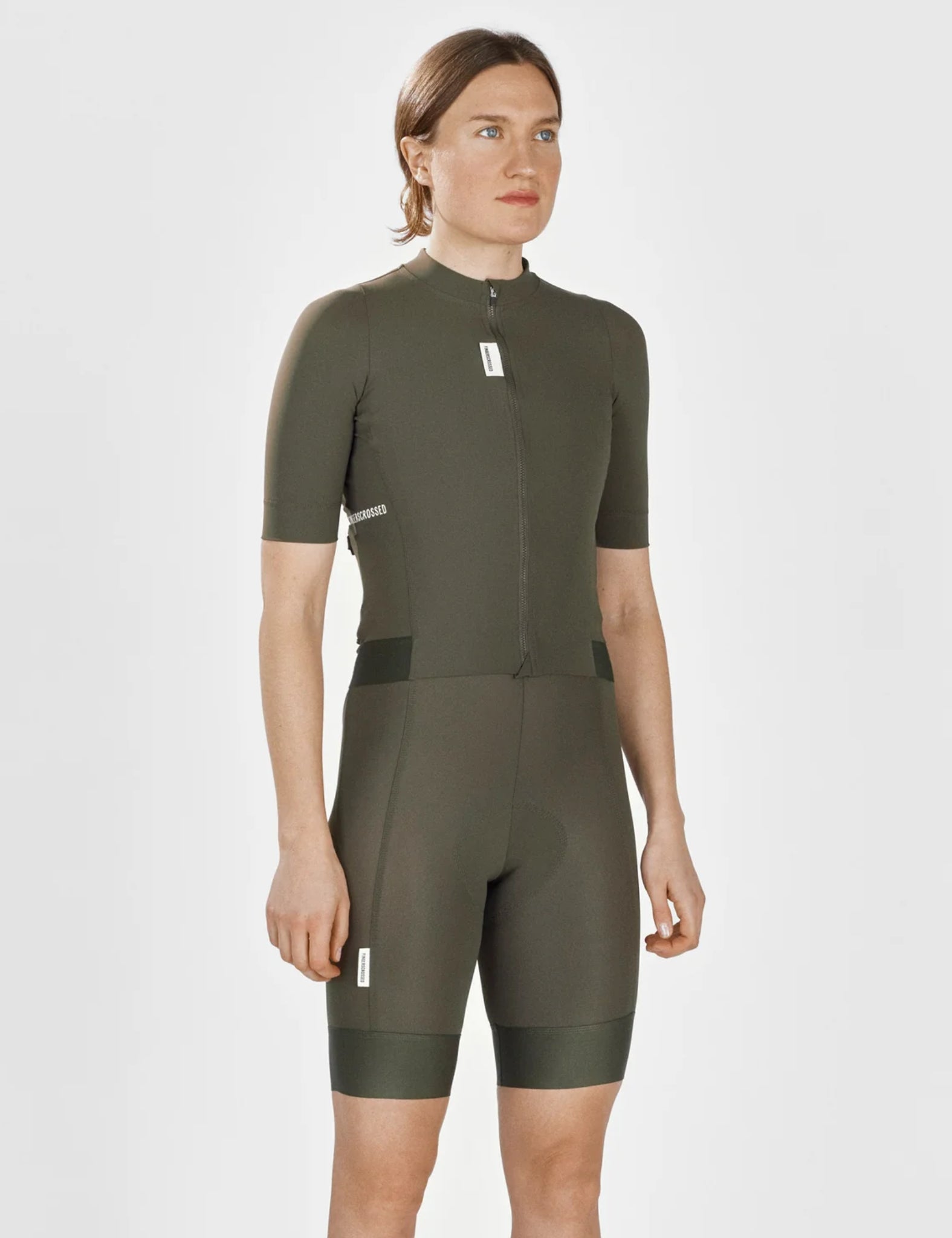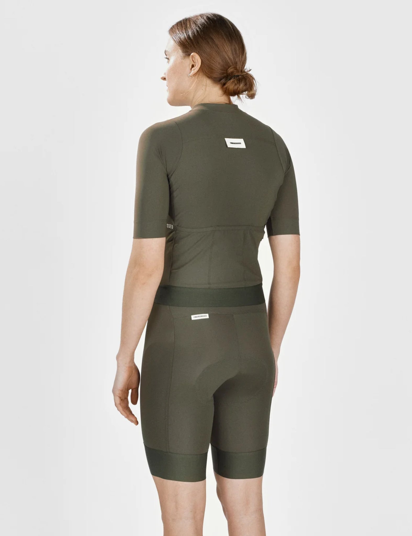 Introducing the Women's Fingers Crossed Road Jersey in olive green. For those longer days and sunnier skies, this jersey has got you covered. It's the go-to pick every year, with top-notch quality and an effortlessly cool design.