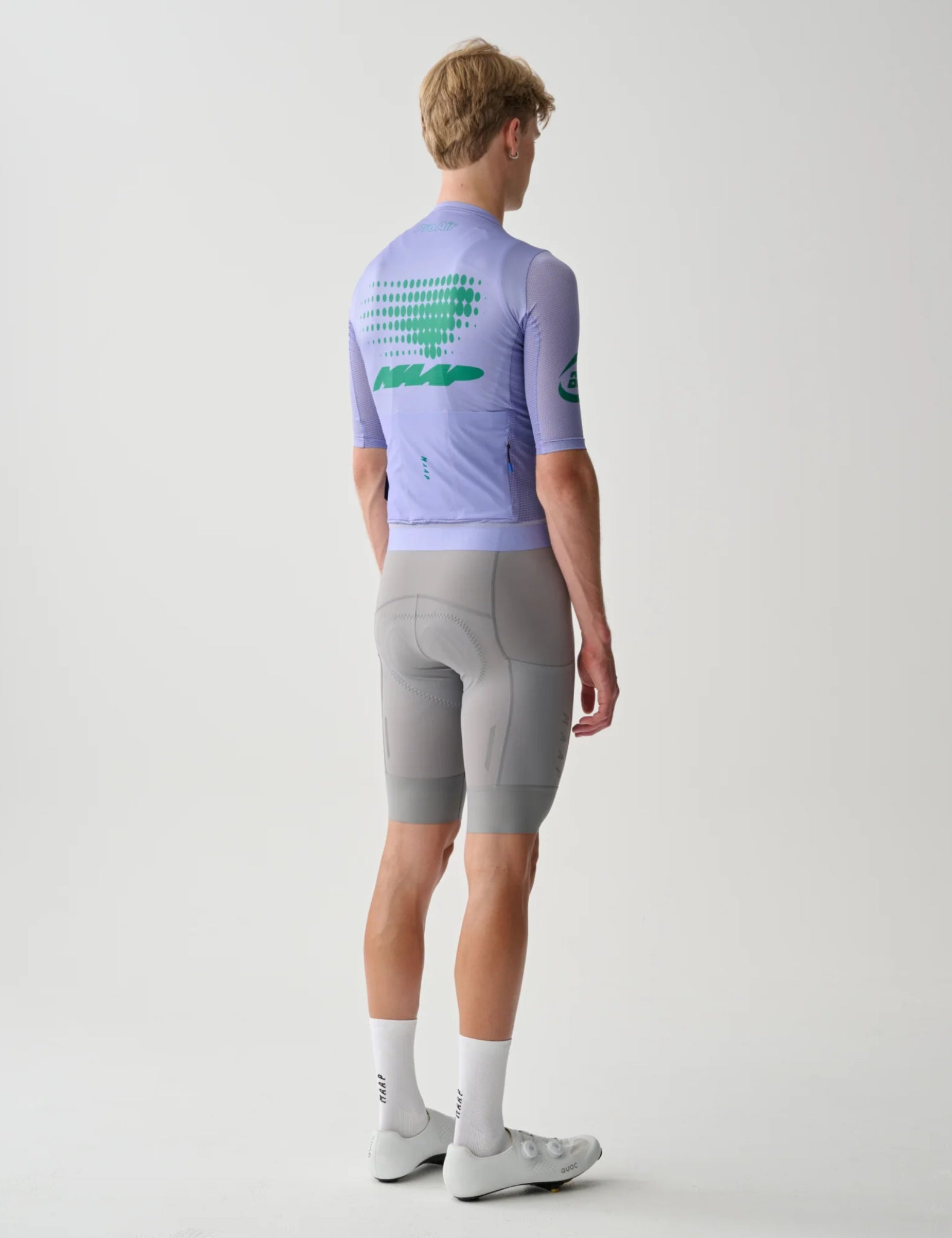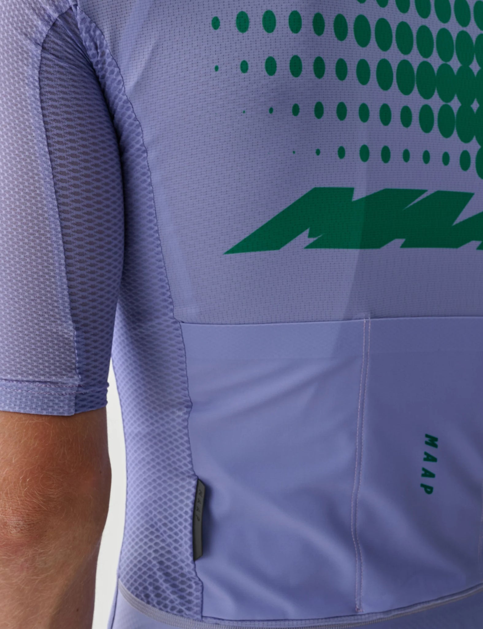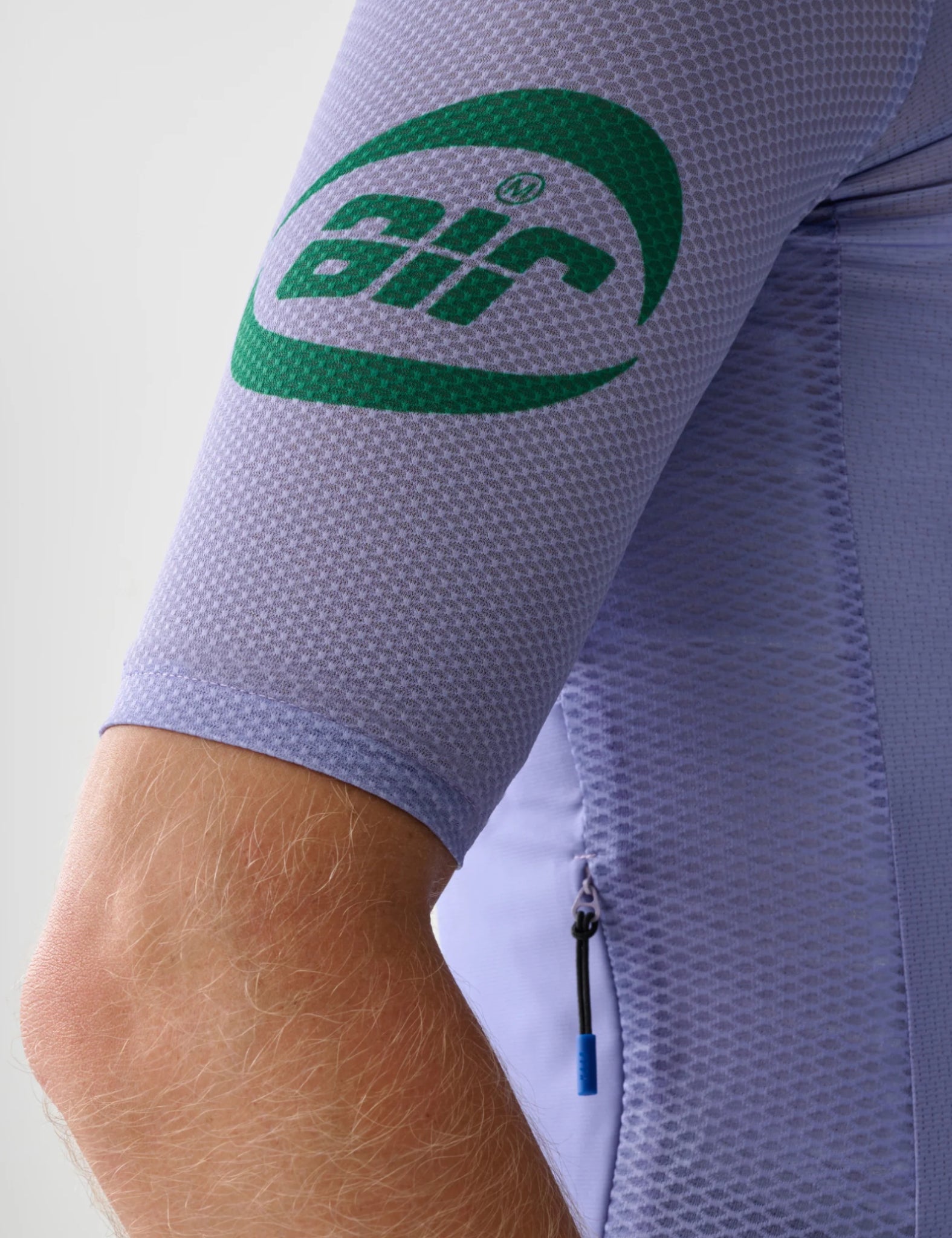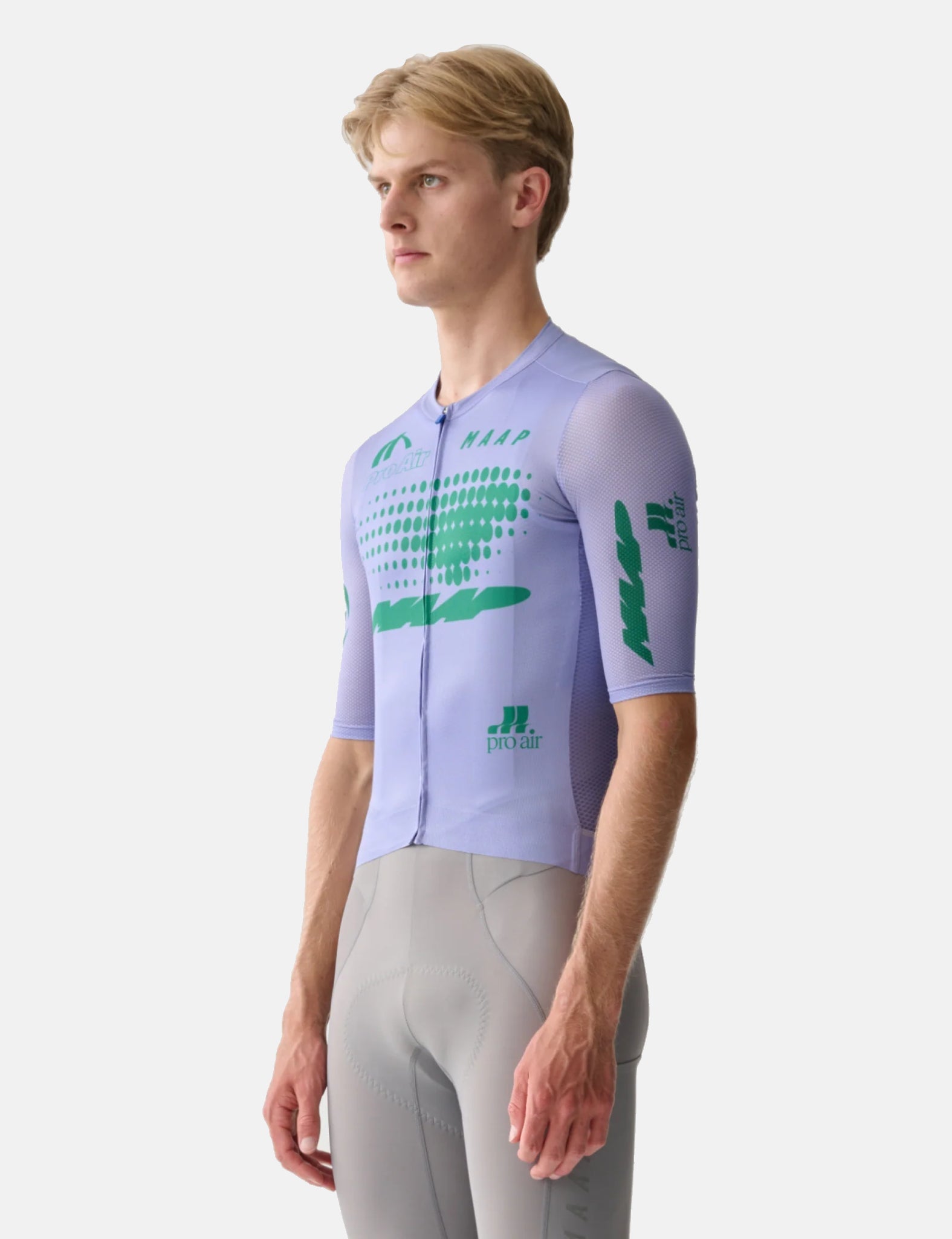 Introducing the Maap Aether Pro Air Jersey 3.0 in periwinkle lilac. Designed to enhance airflow, this jersey features expertly placed open mesh panels for maximum breathability in hot conditions.