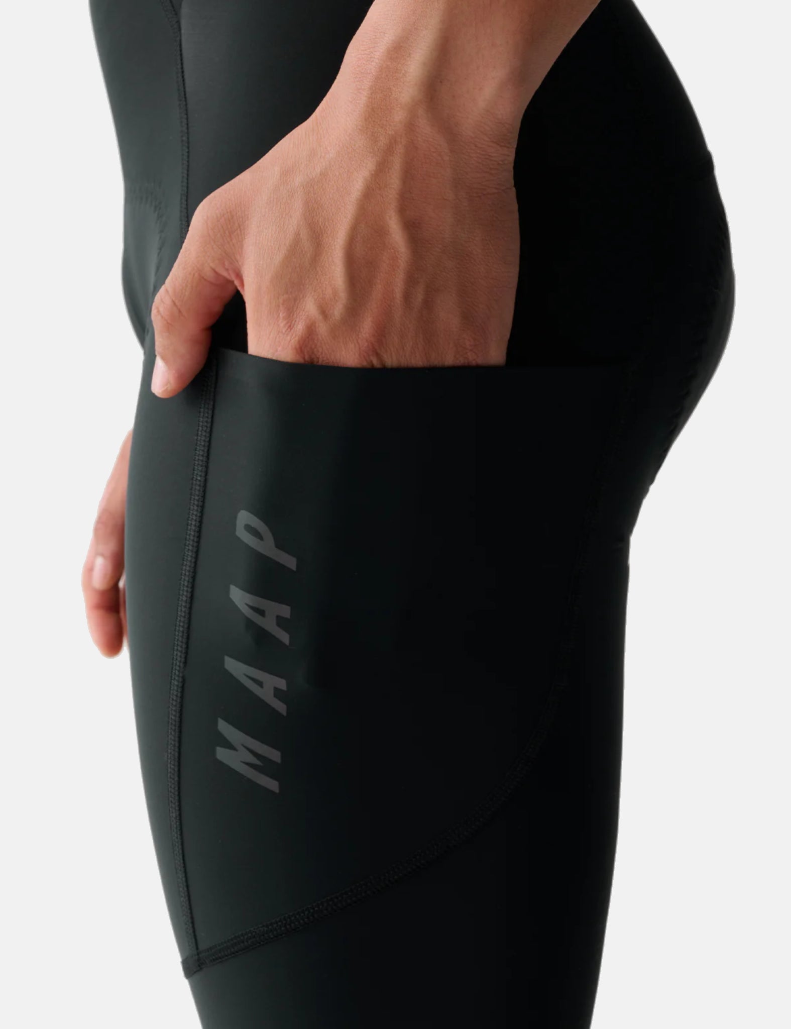Introducing Maap's Team Bib Evo Cargo Tights in sleek black. These tights combine top-notch performance and style with innovative cargo pockets for added storage. Whether you choose to ride in a jersey or a tee, these lightweight tights have got you covered.