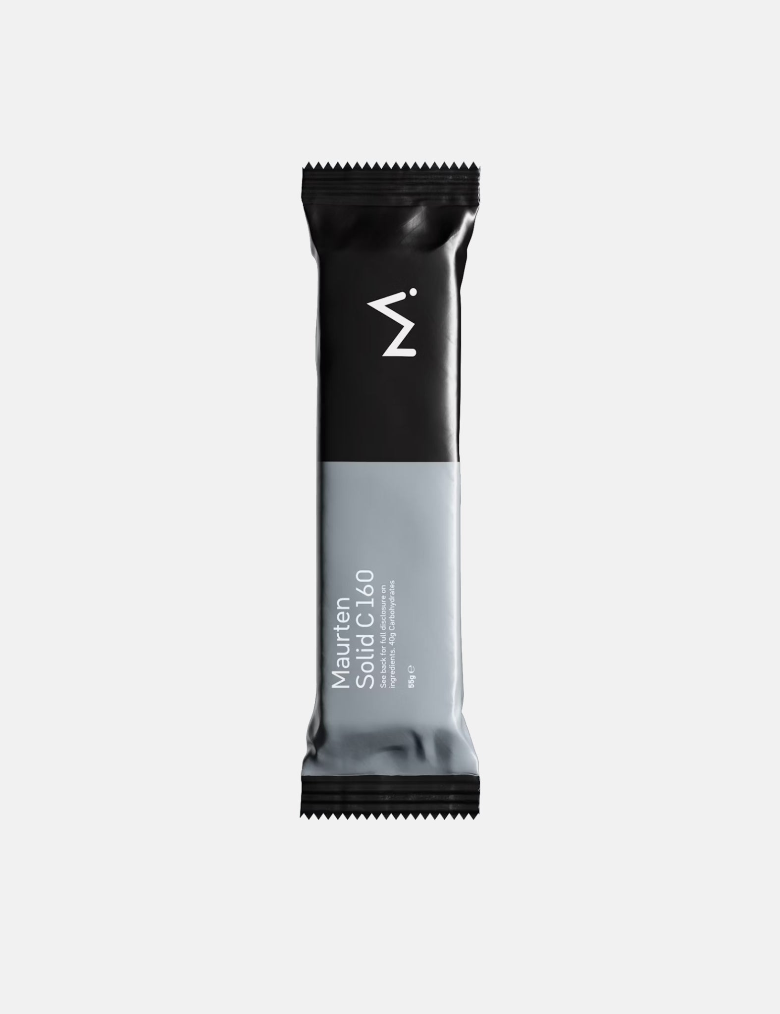 Maurten's Solid 160 bar is crafted with oats and rice, divided into two portions - one package containing two mini bars. With 40 grams of carbs divided evenly into 20-gram portions, this fueling essential is quick, light, low in fiber, and packed with carbs for optimal performance.