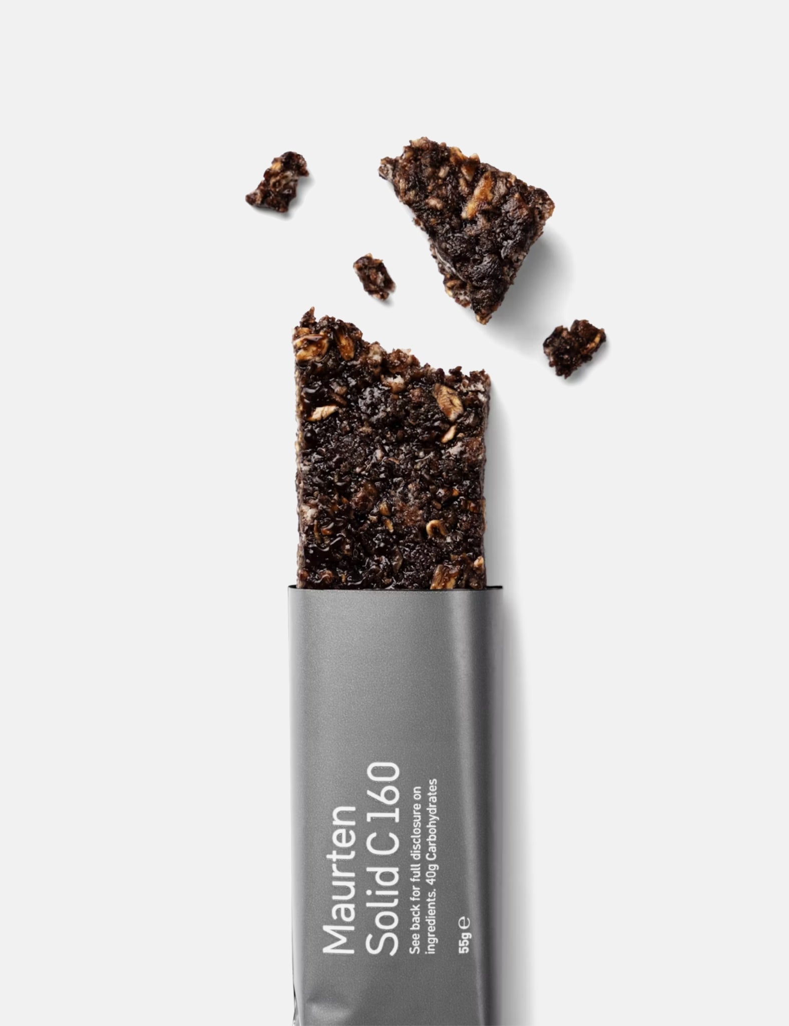 Maurten's Solid 160 bar is crafted with oats and rice, divided into two portions - one package containing two mini bars. With 40 grams of carbs divided evenly into 20-gram portions, this fueling essential is quick, light, low in fiber, and packed with carbs for optimal performance.