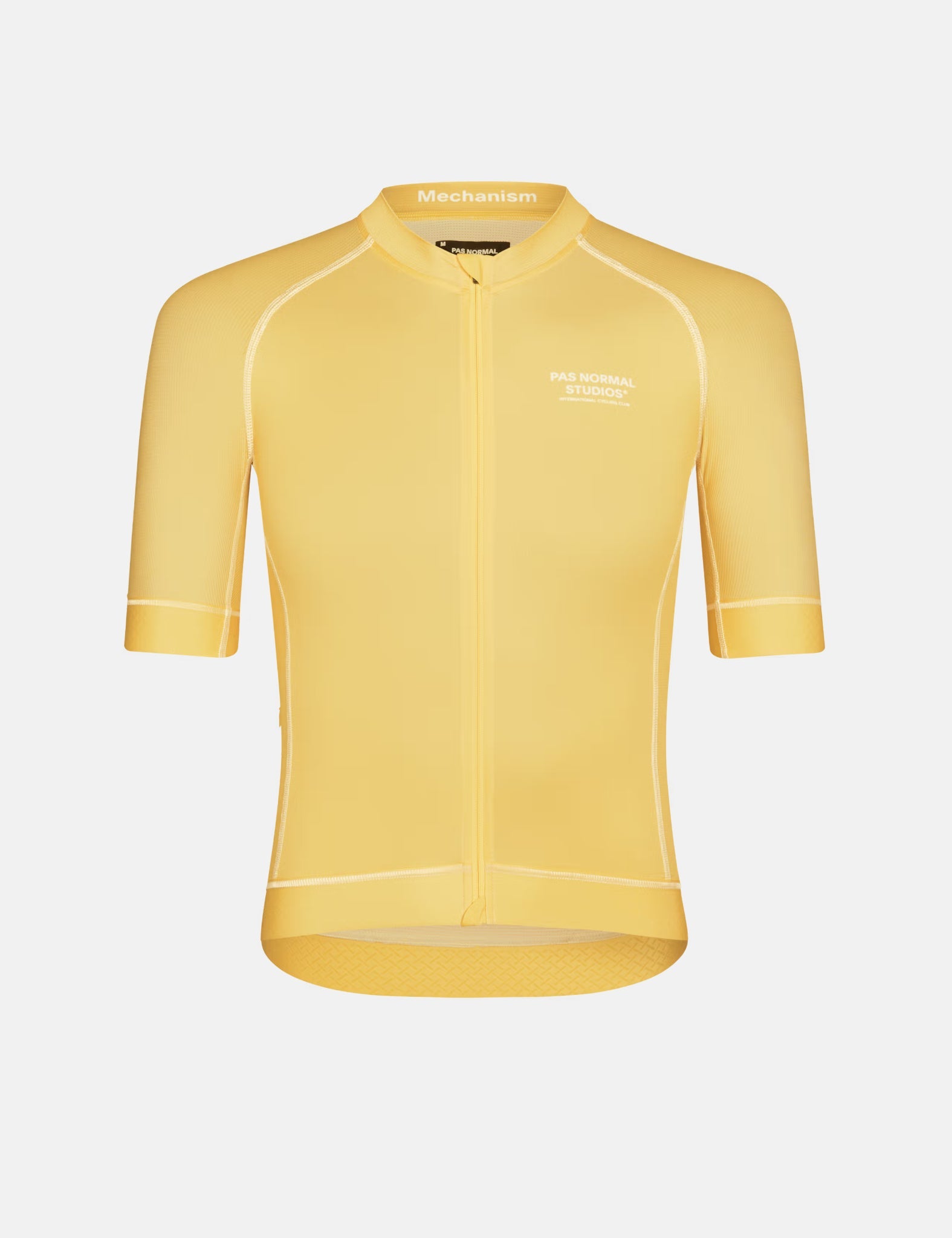 Experience comfort, style, and performance in one with the Pas Normal Studios Mechanism jersey in dusty yellow.