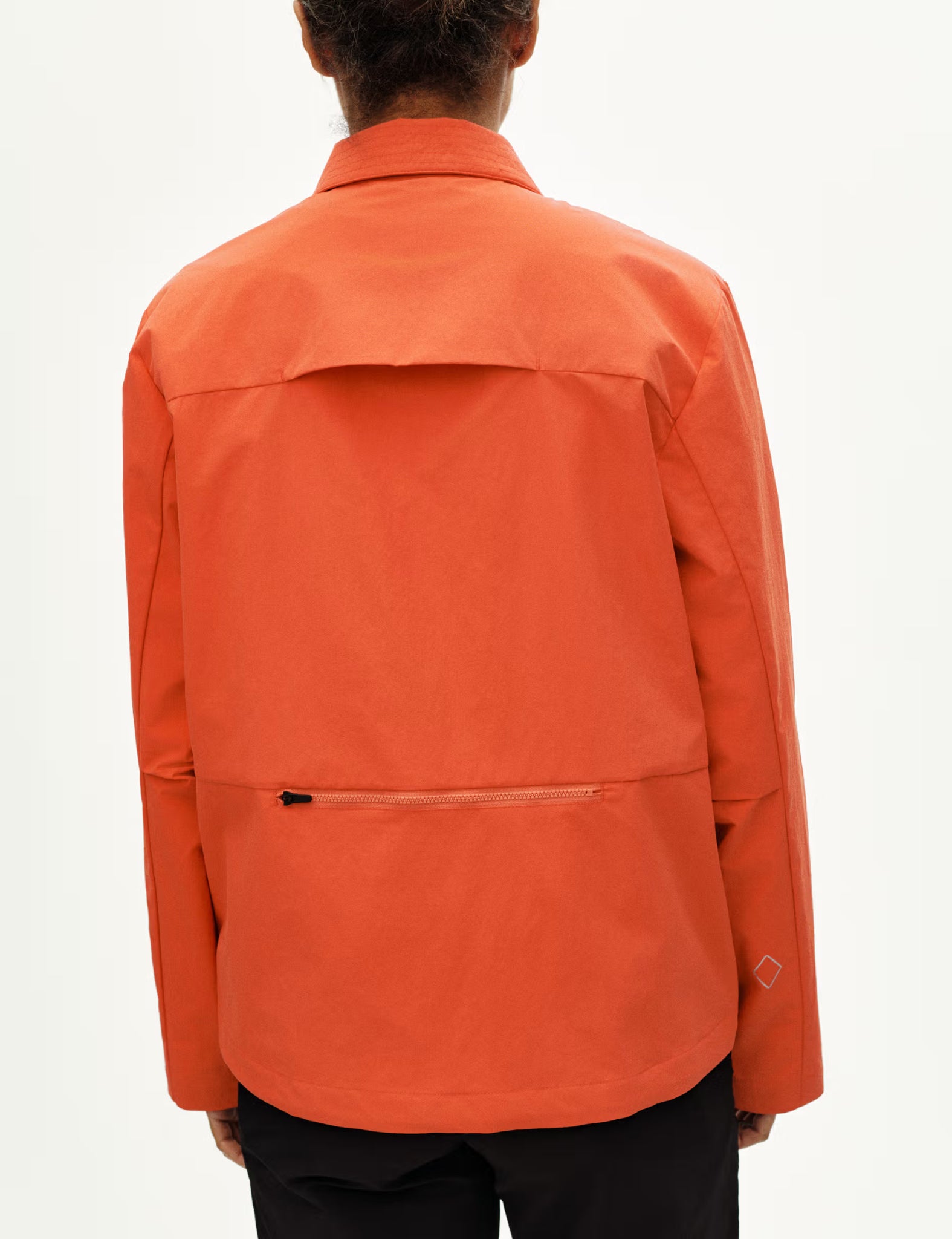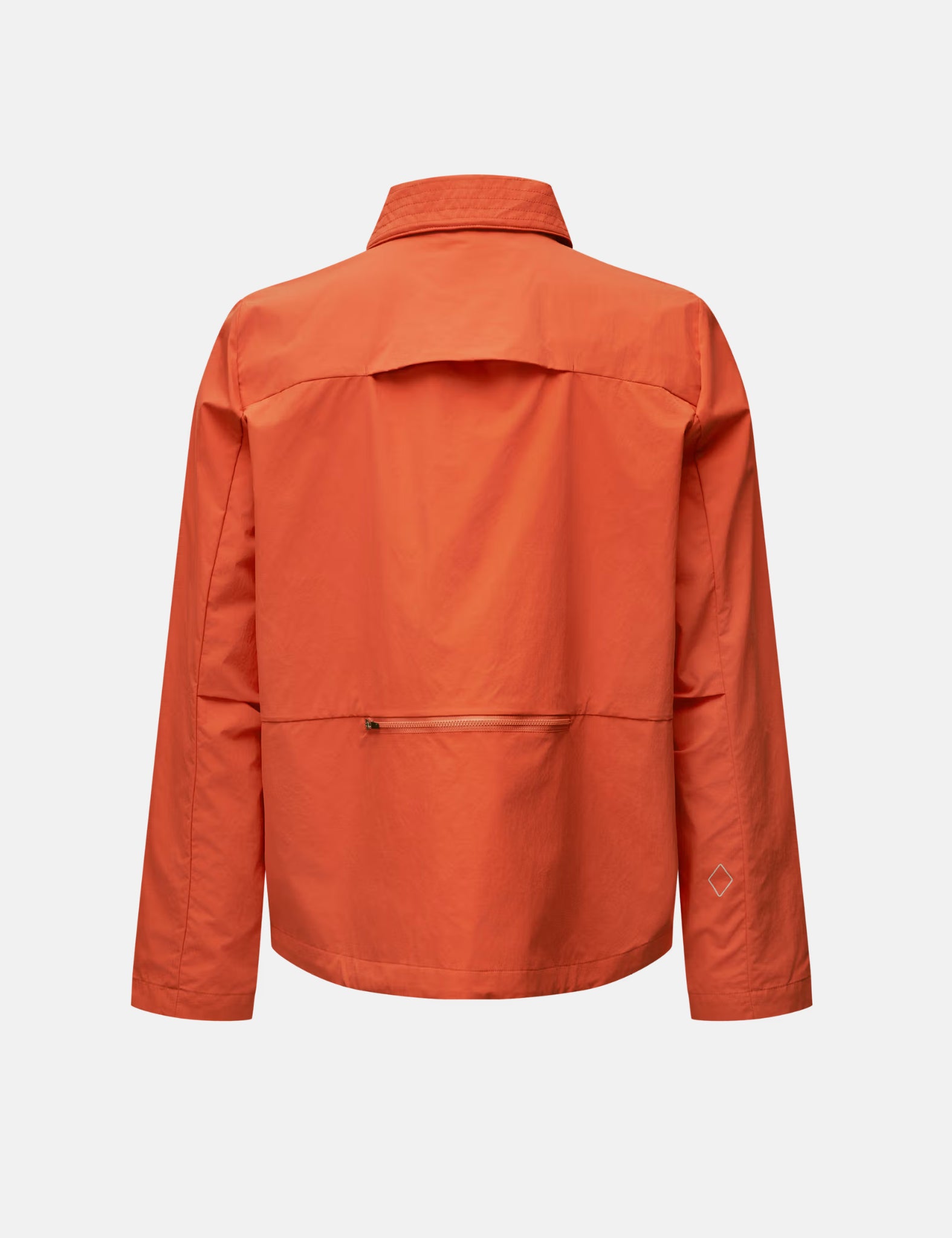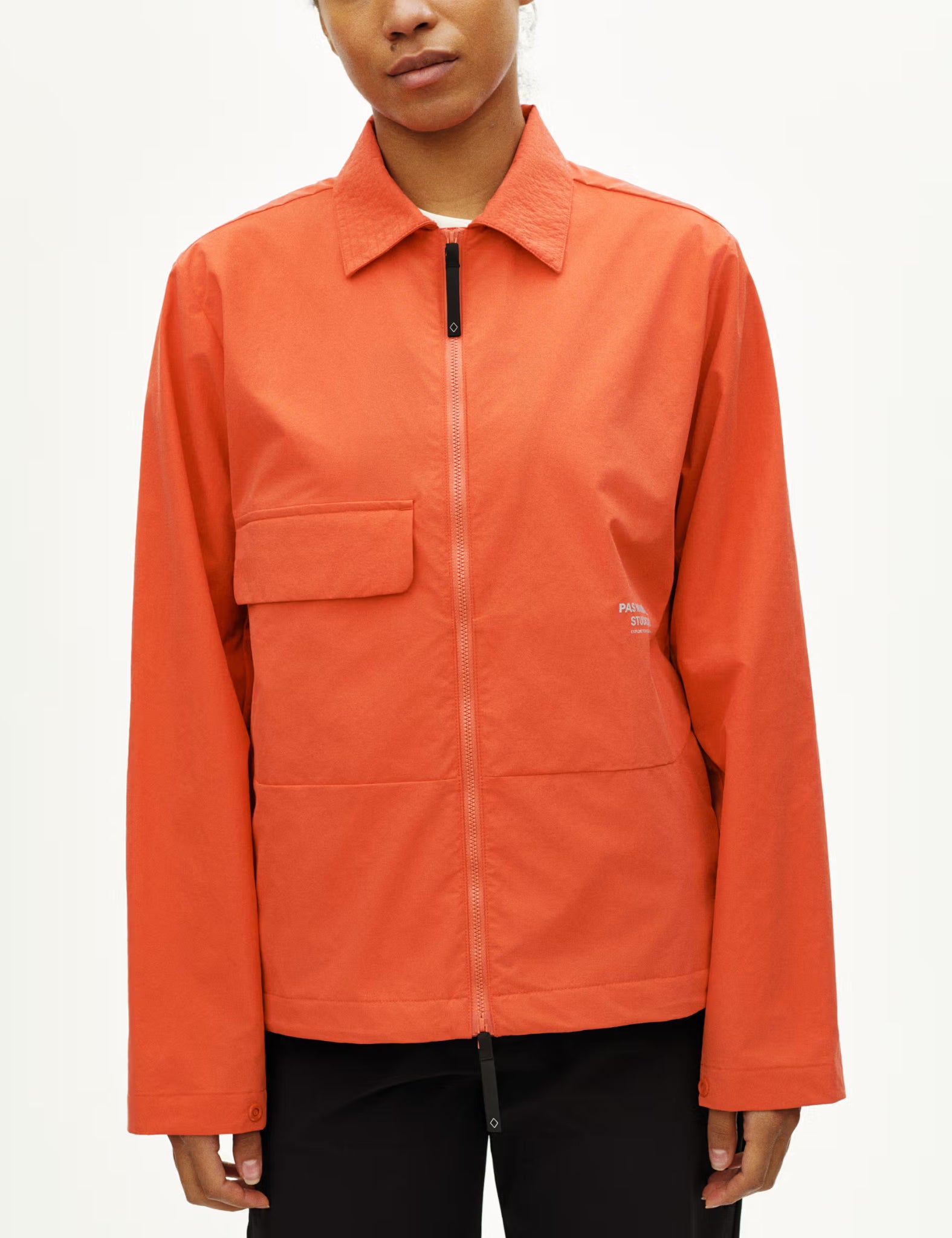 Engineered for unpredictable weather, the Pas Normal Studios Off-Race Utility Jacket combines practical design with eye-catching hibiscus orange styling.