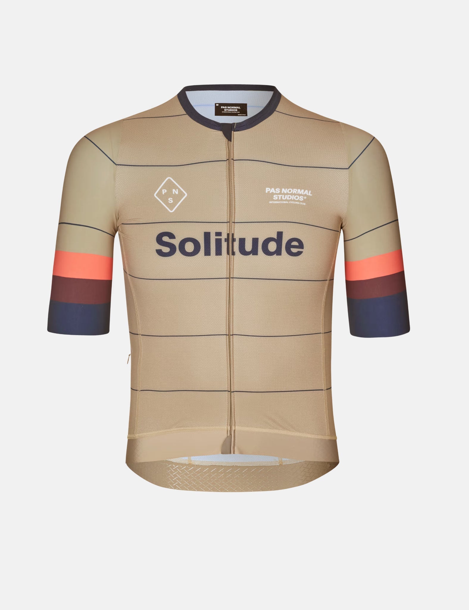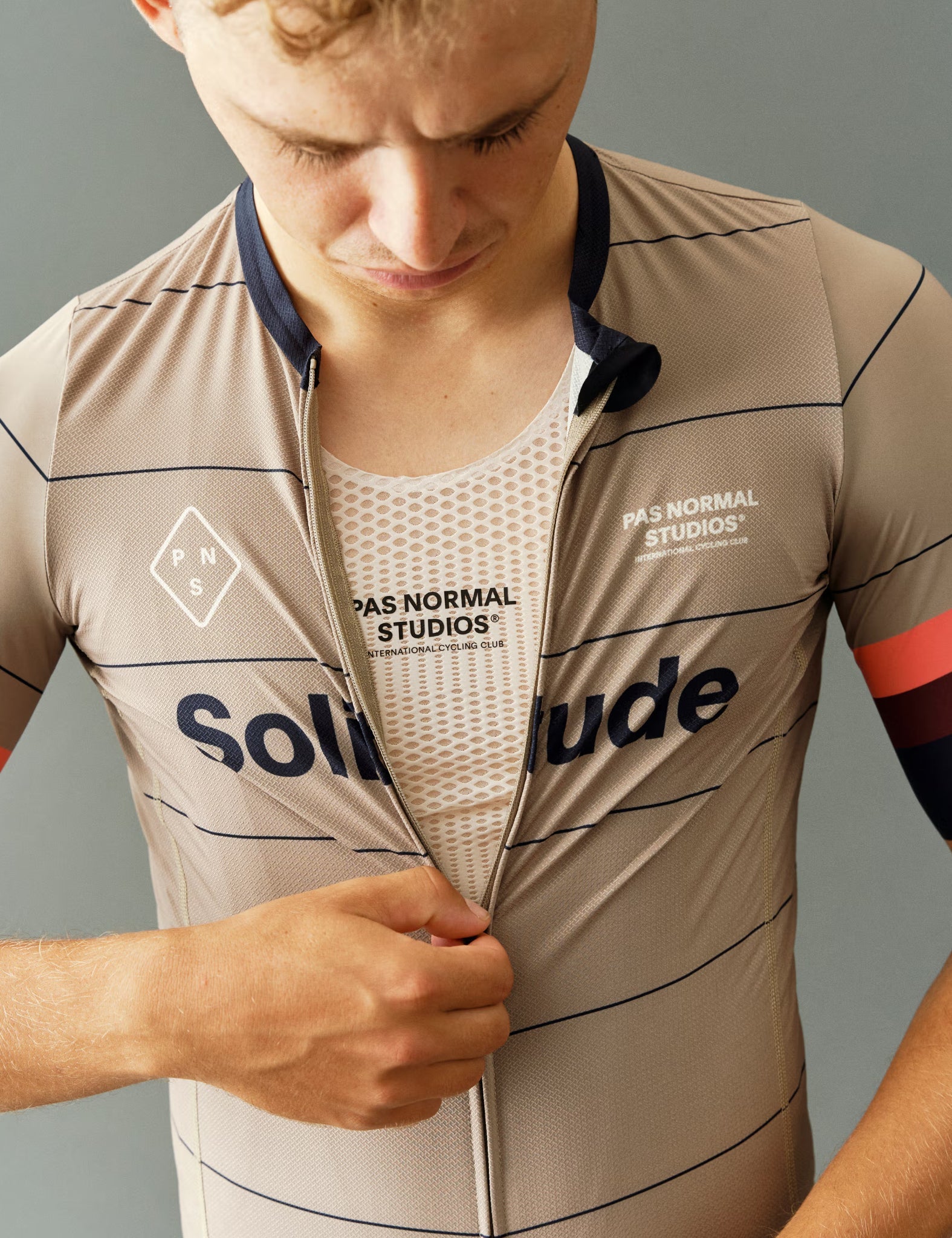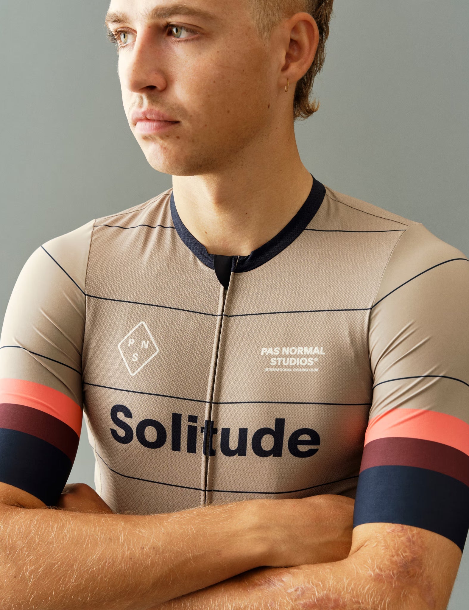The Pas Normal Studios Solitude Late Drop Jersey features pockets that are super easy to reach and lowered armholes for comfort while riding.