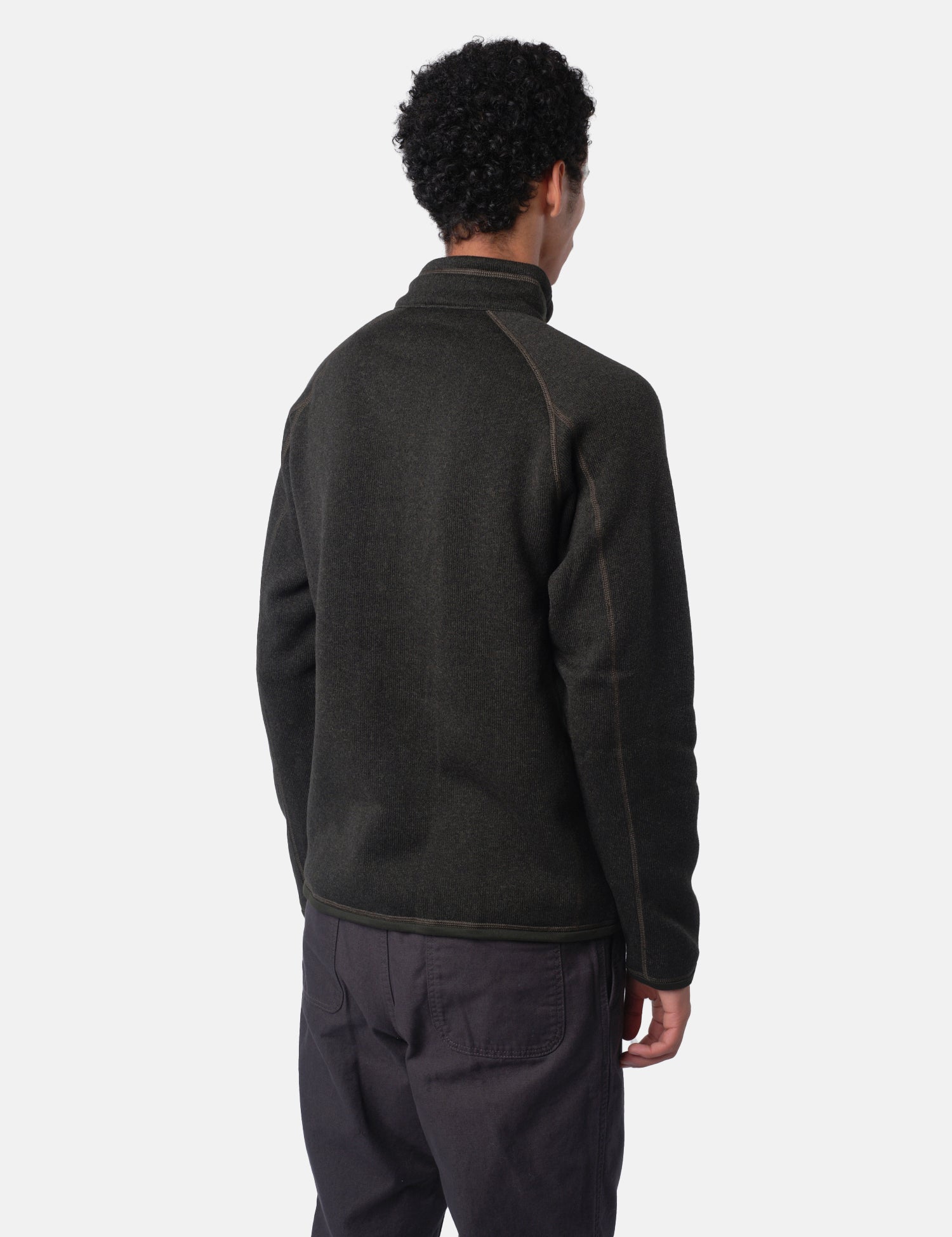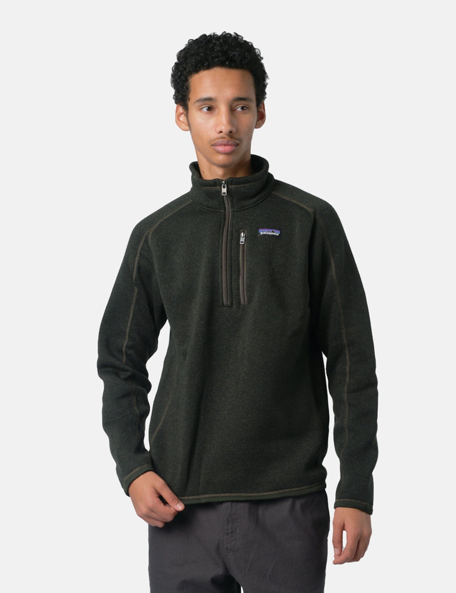 The Patagonia Better Sweater 1/4 Zip Sweatshirt comes in old growth green. This quarter-zip jacket is made of 100% recycled polyester and features a unique sweater-knit design.