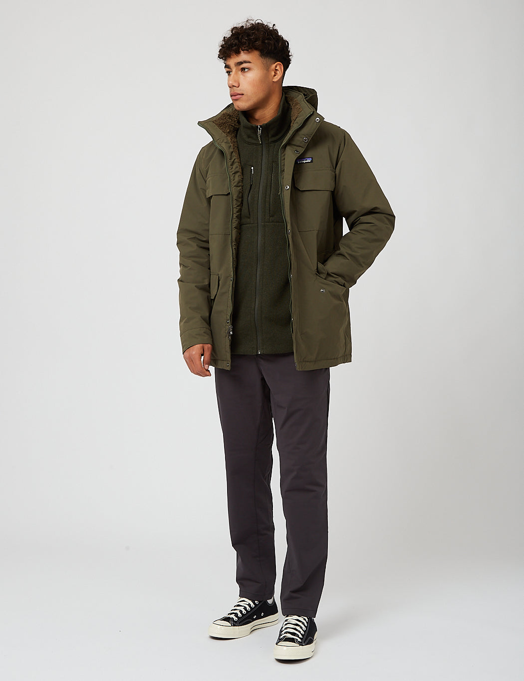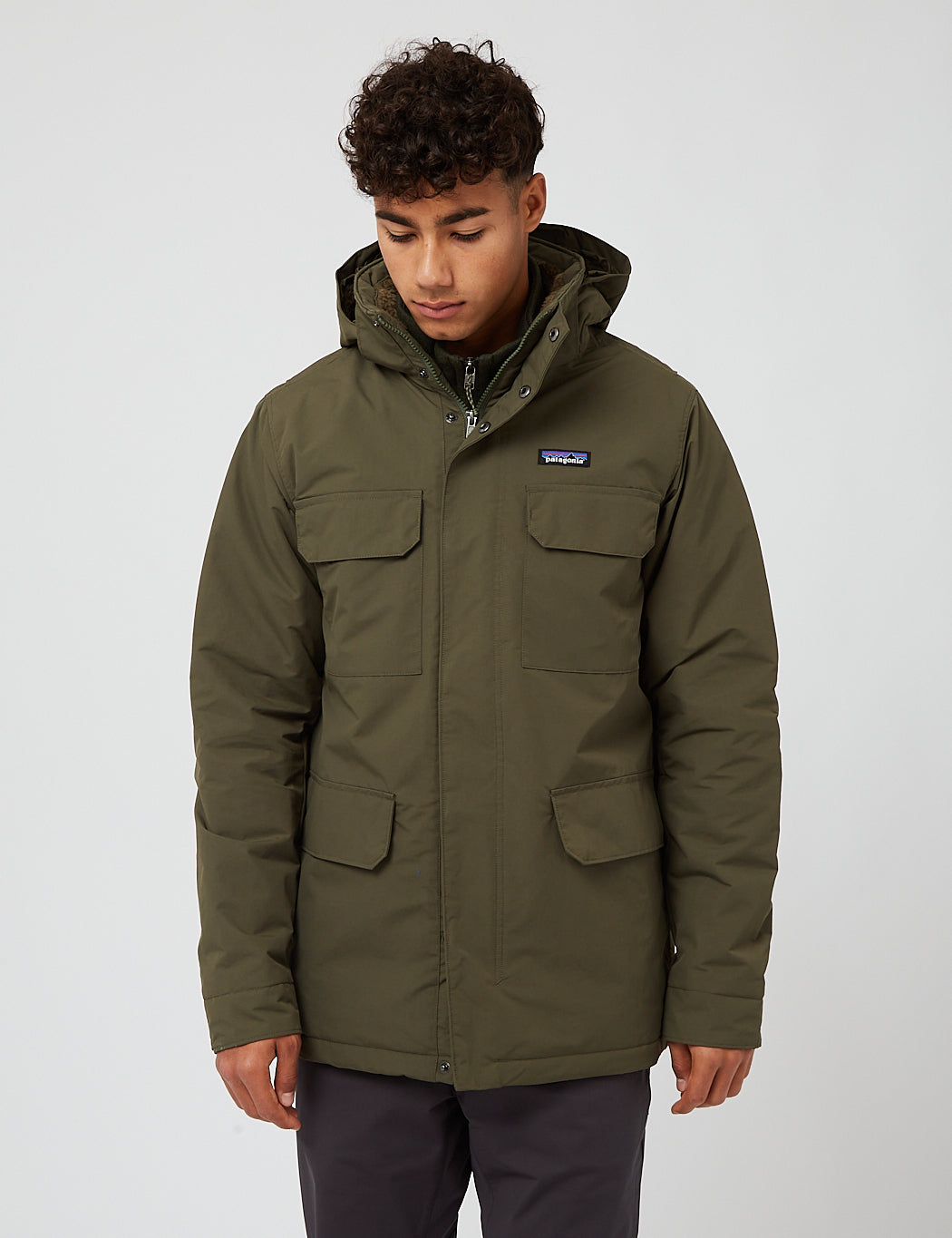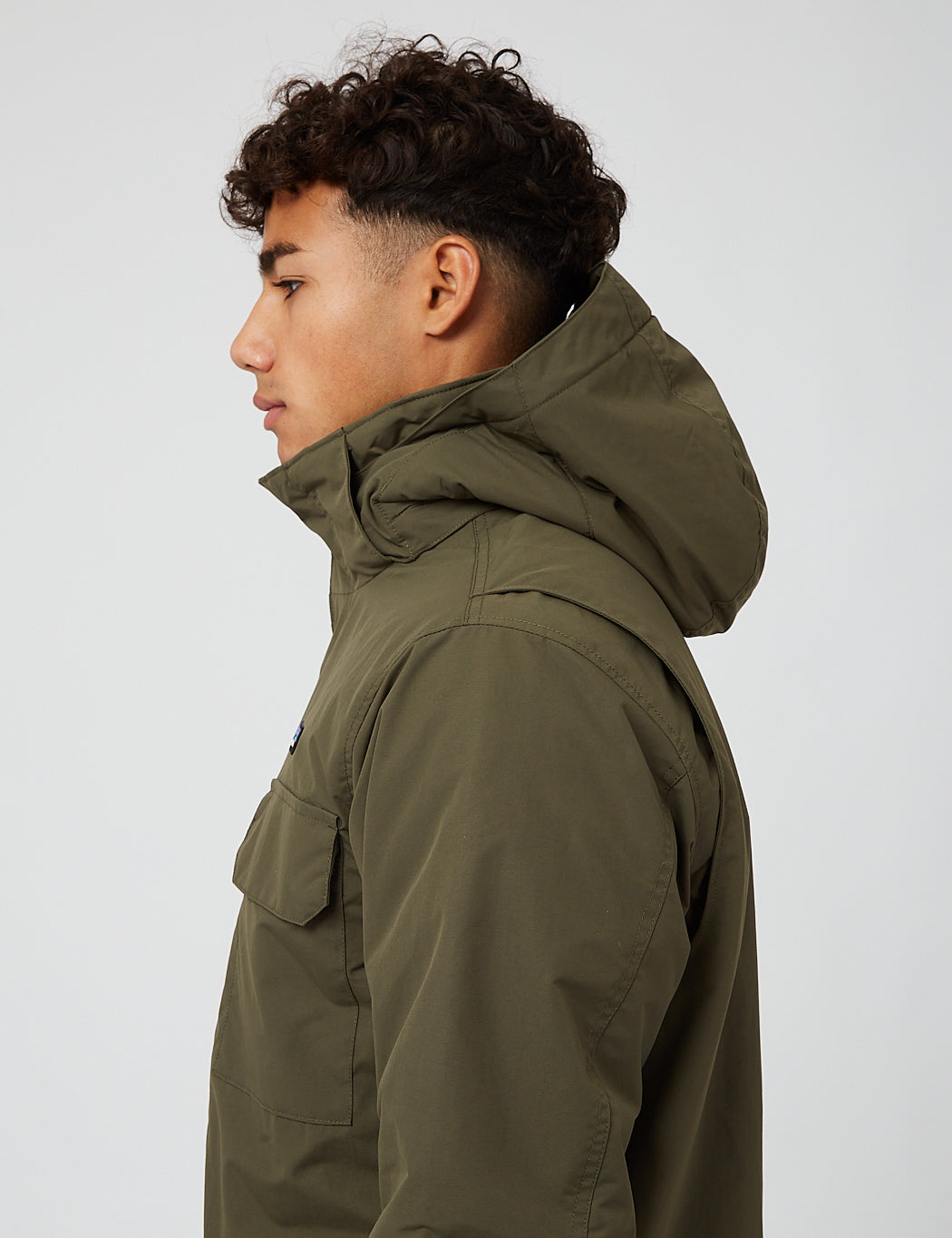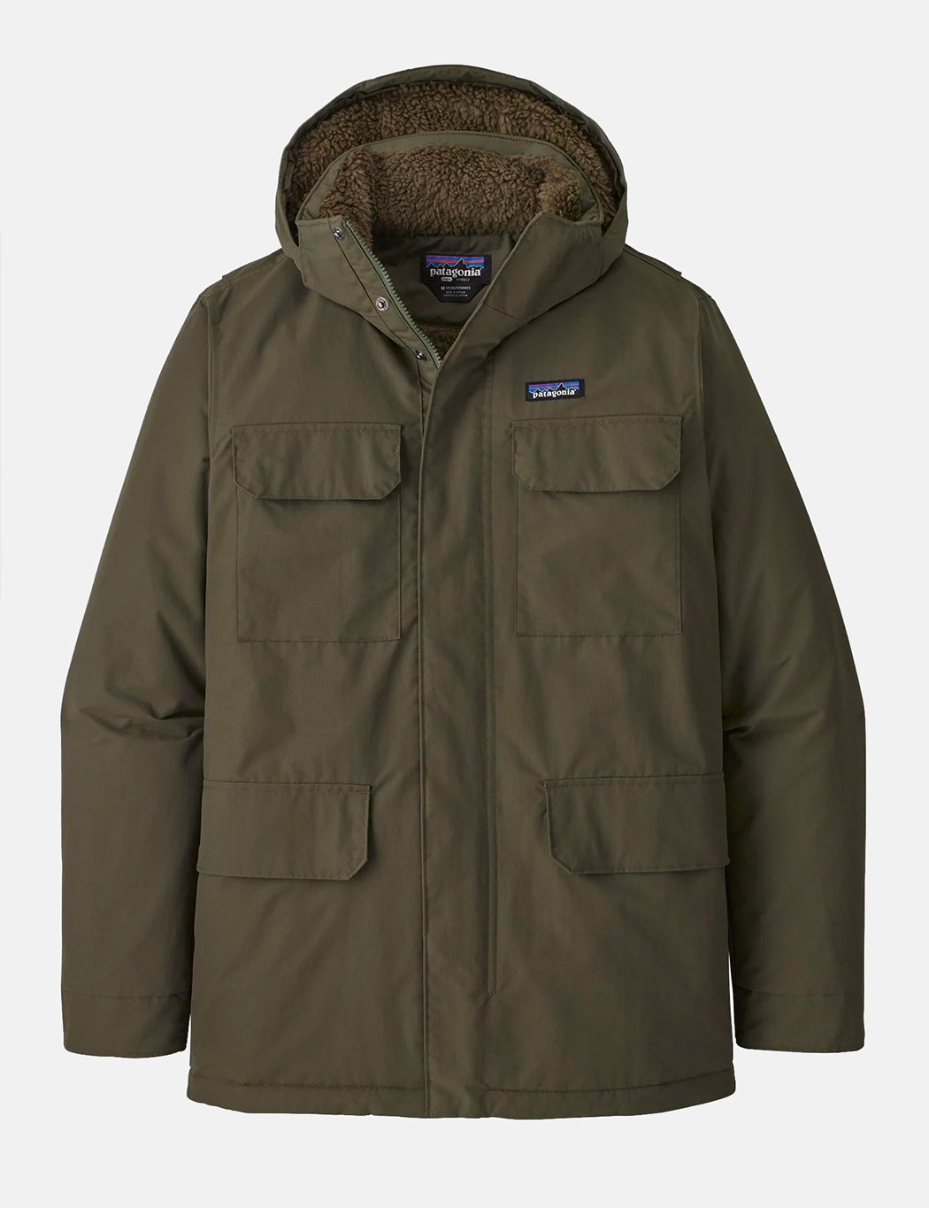 The Patagonia Isthmus parka jacket in basin green a classic weather-resistant ‘60s-inspired expedition parka in NetPlus 100% post consumer recycled nylon made from recycled fishing nets to help reduce ocean plastic pollution.