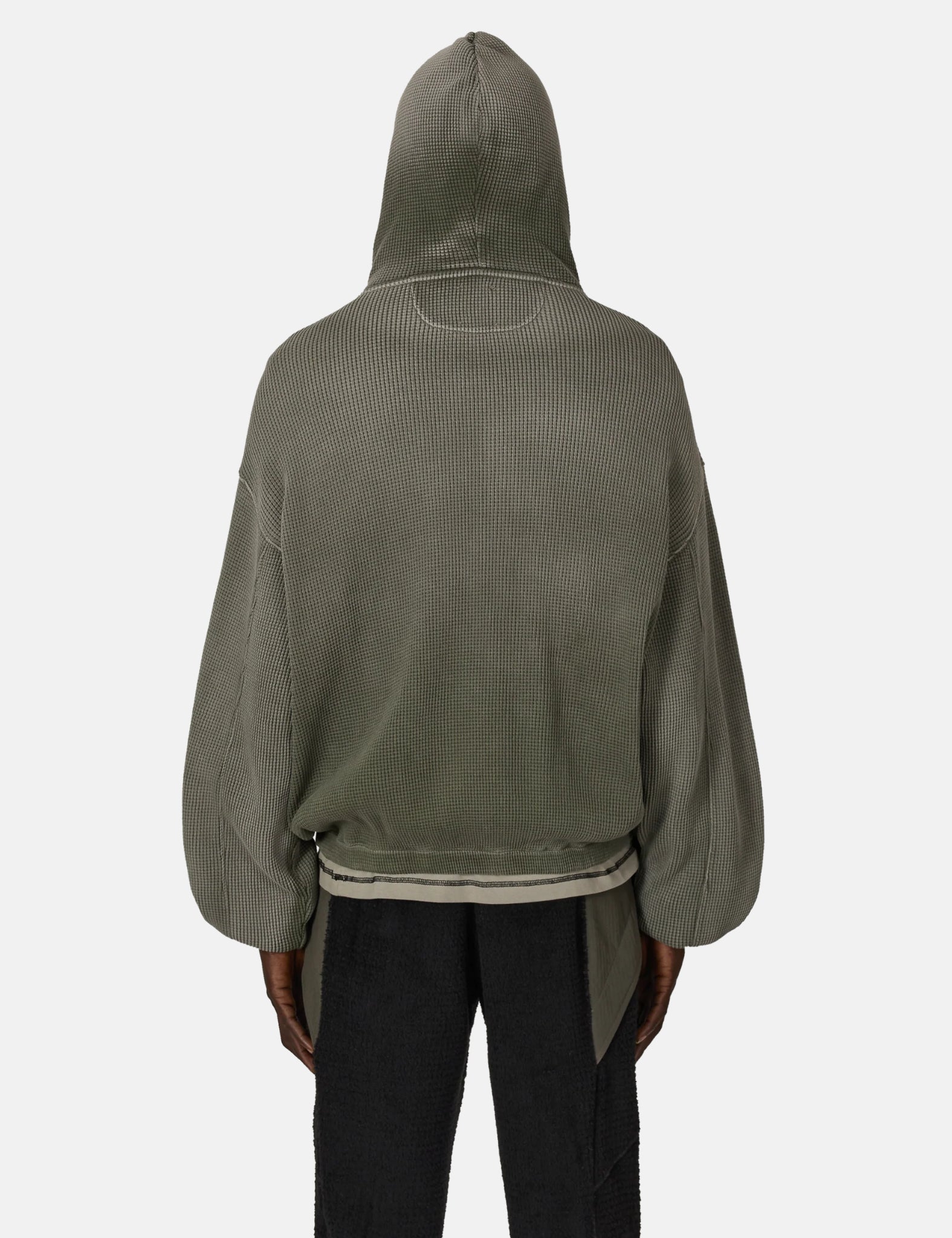 The ROA Bee Sun Faded Waffle zip-up hoodie in olive green is made from cozy, heavy waffle fabric with a charmingly worn-in look. Its boxy cut offers a laid-back vibe, and the front zipper makes layering a breeze.