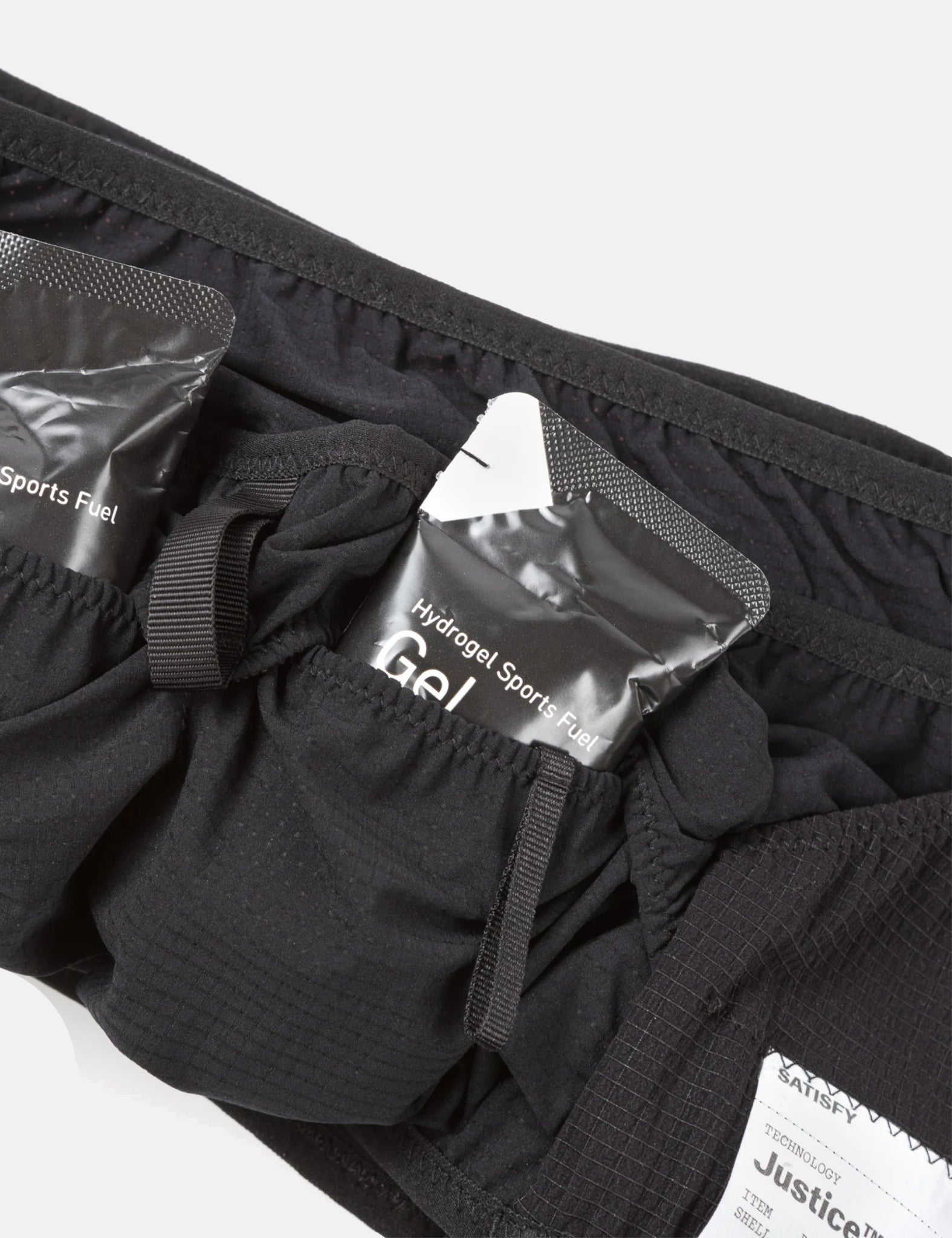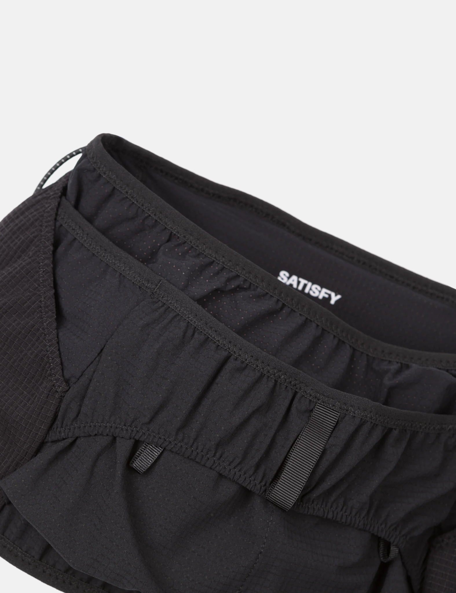 The Satisfy Justice Dyneema Trail Band in black is an ultra-lightweight and breathable way to carry all your gear for long distances.