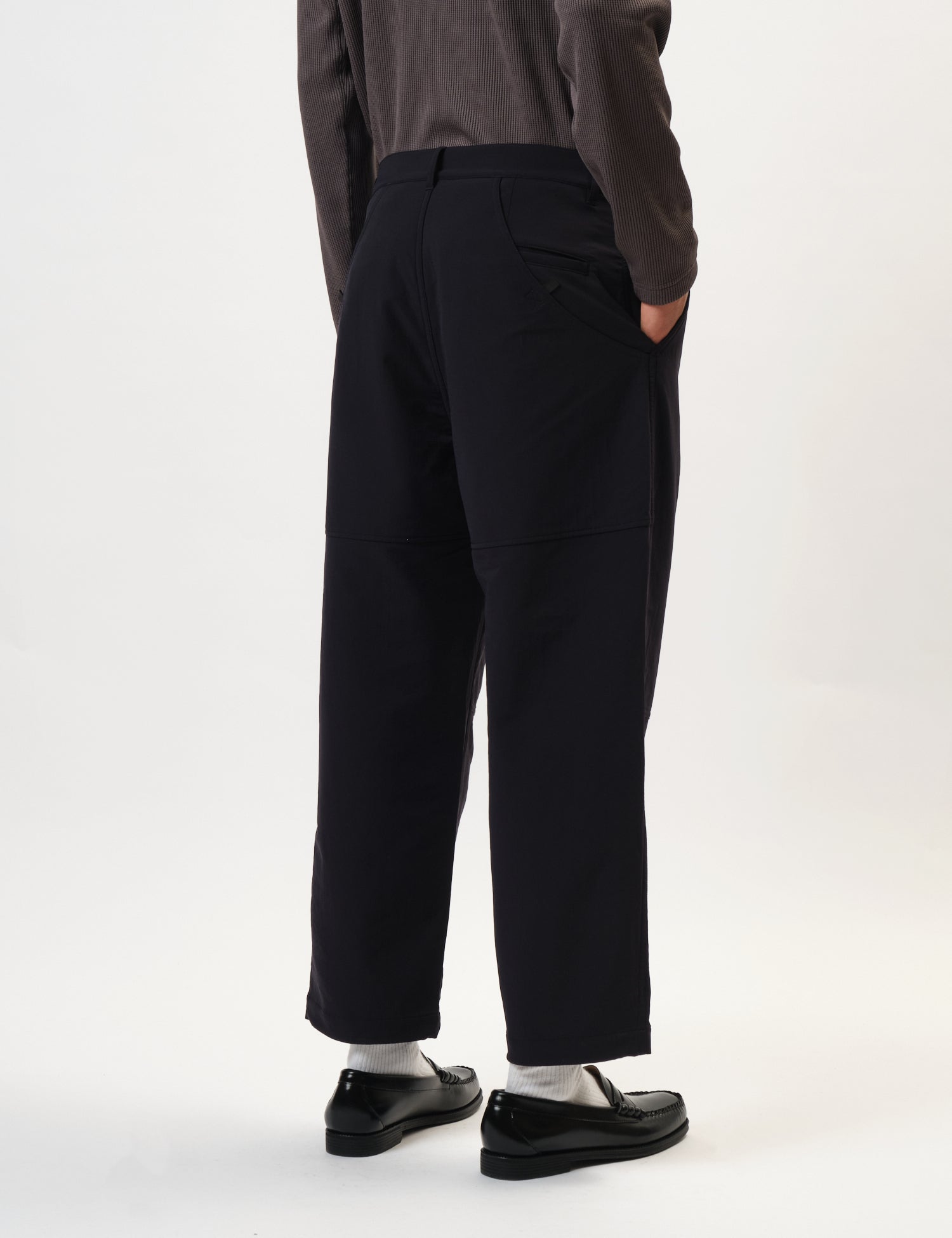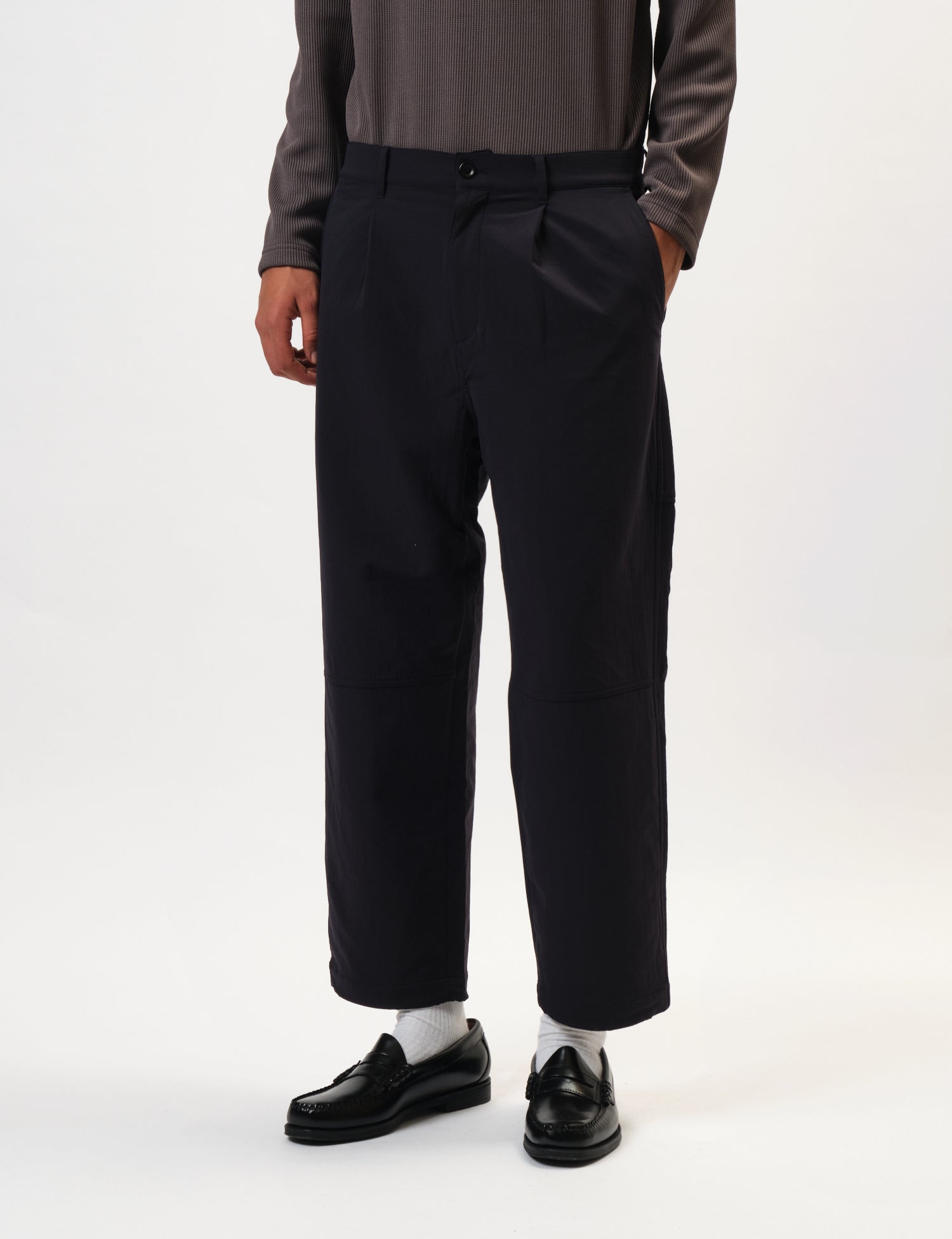 The Snow Peak Easy Cloth Pants in dark navy blue bring roomy tool pockets and a comfy, tapered fit with a one-tuck waist, giving you plenty of space and freedom to bend your knees.