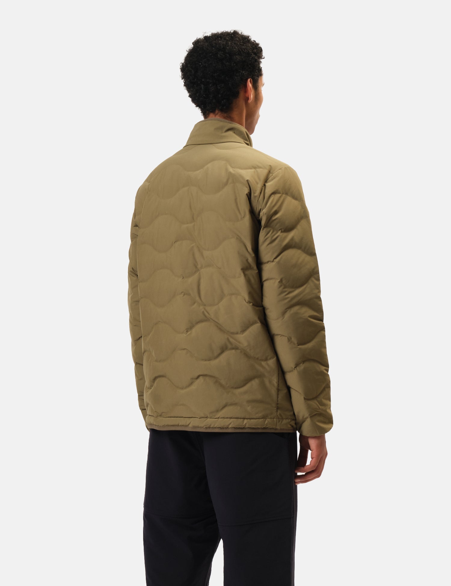 The Snow Peak Seamless Quilted Down Jacket in olive green strikes the perfect middle ground between bulky coats and light mid-layers. Its military-inspired quilting and stand collar bring style and function together.