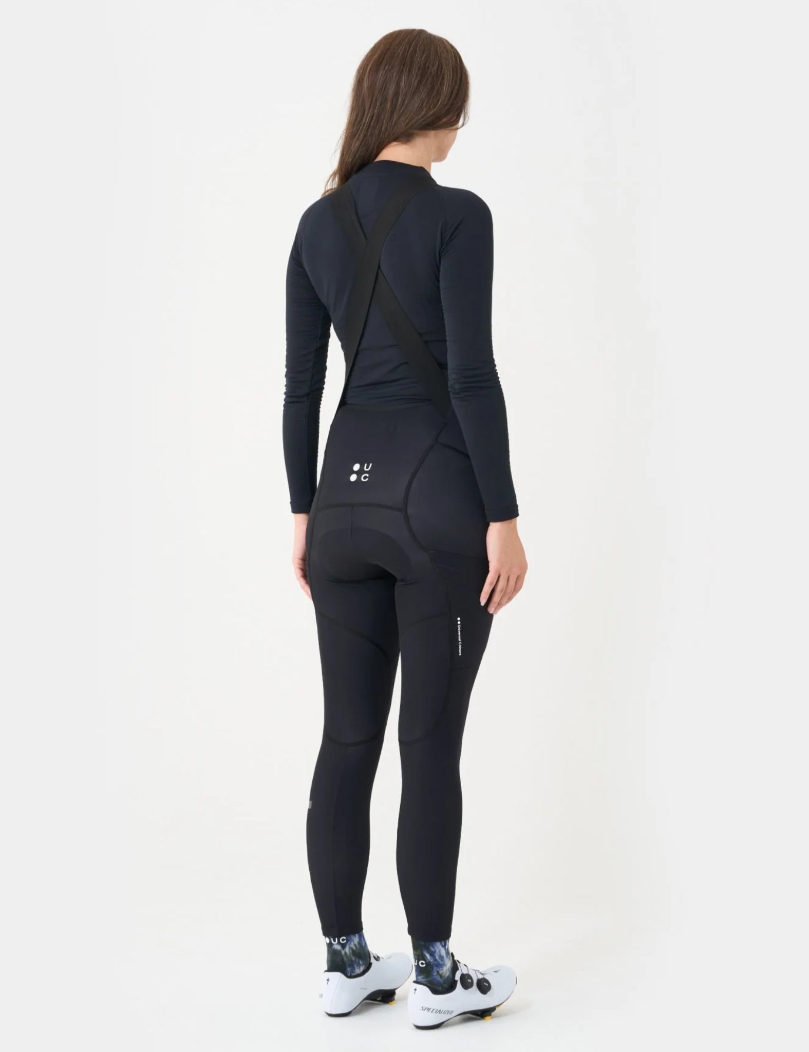 Slip into the Womens Universal Colours Mono Bib Tights in black, your new cold-weather cycling ally! Crafted from recycled nylon with a cozy brushed back and a PFC-free DWR finish, these tights shrug off light rain and road spray like a champ.