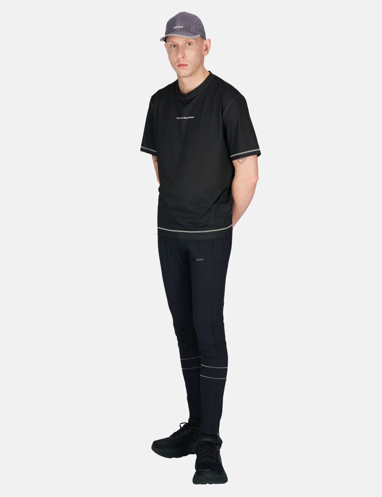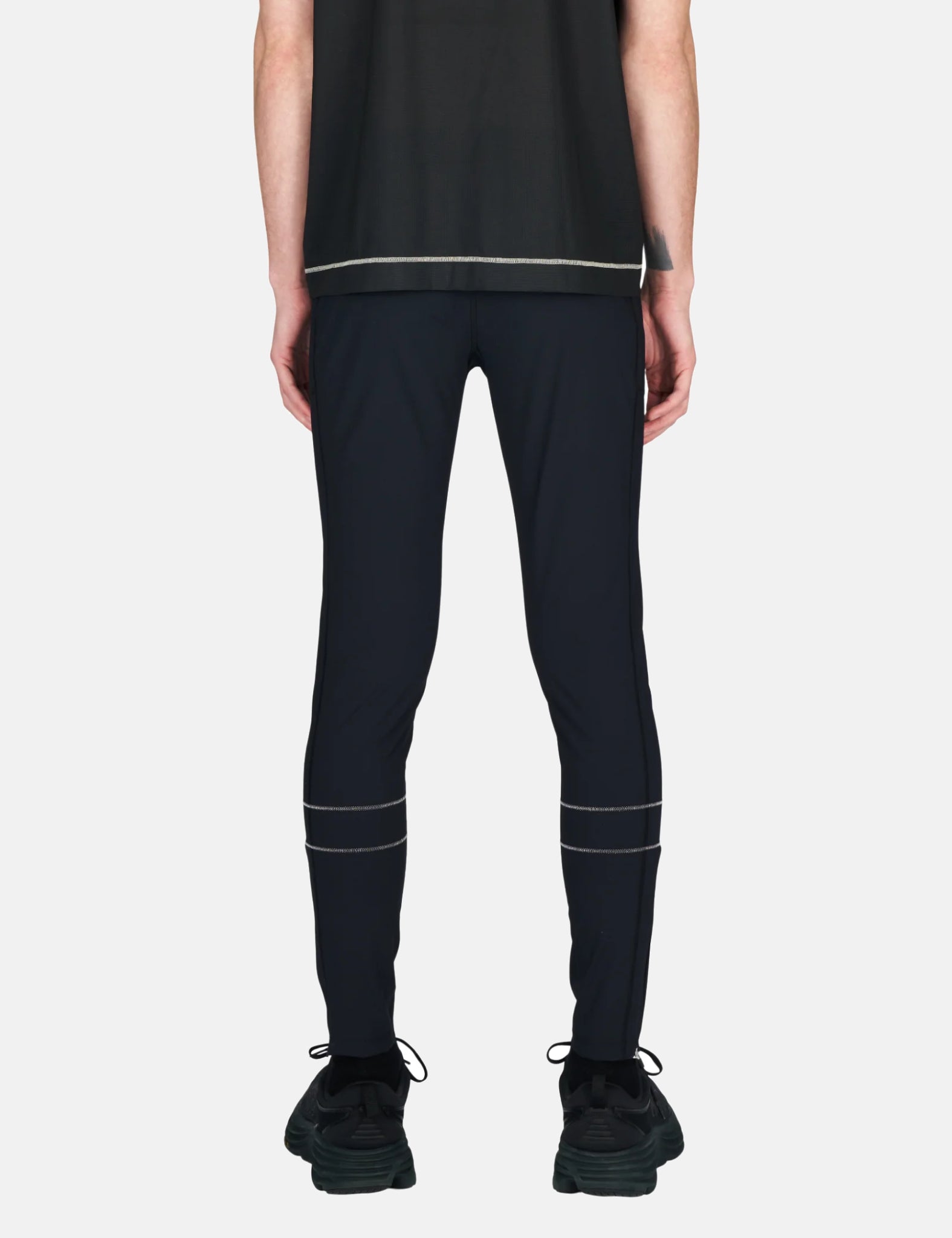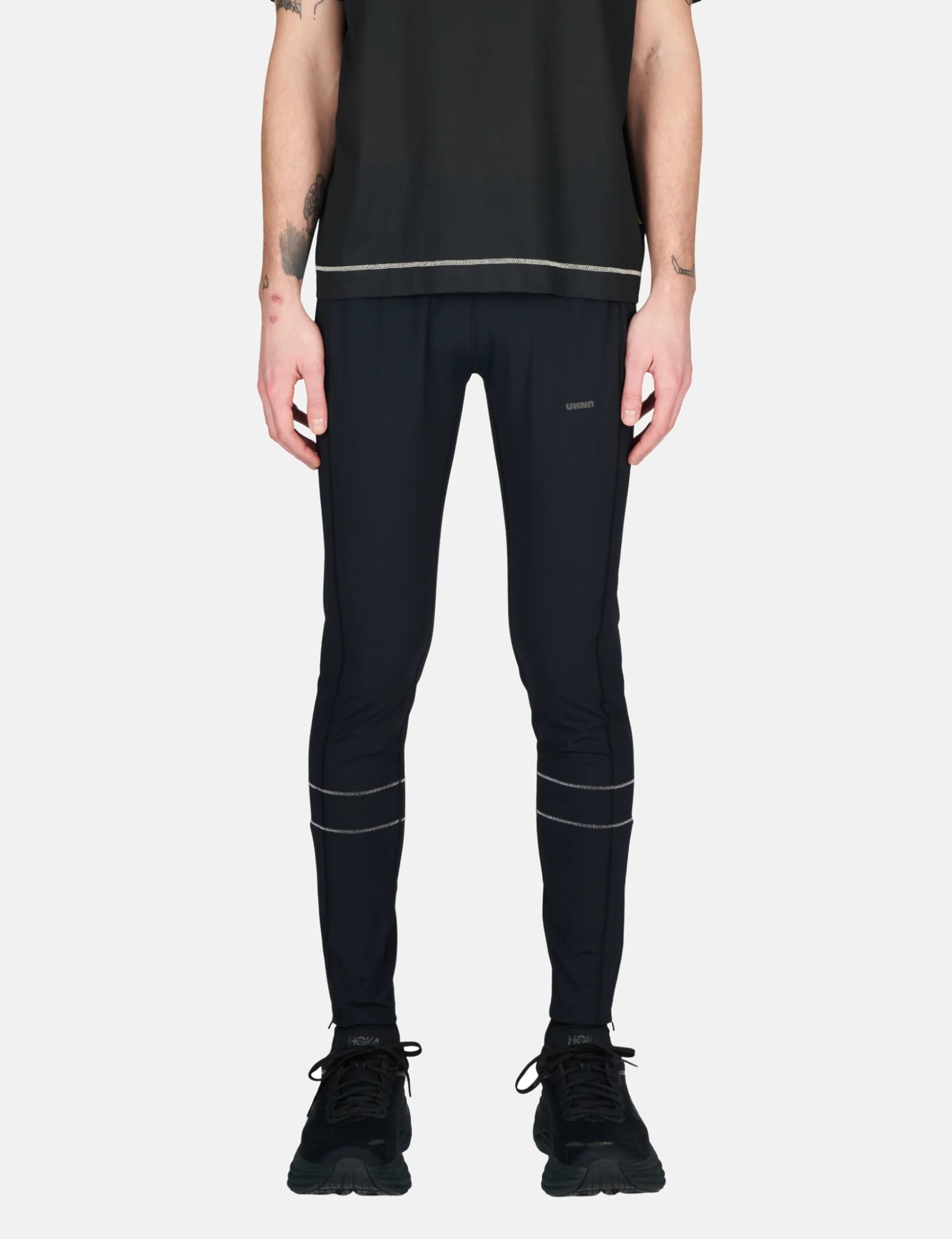 Presenting the black UNNA Boost Tights for men, featuring two reflective seams on the bottom of each leg. These tights are made from ECONYL, a regenerated Nylon and elastane blend, providing UPF 50+ protection against UV rays.