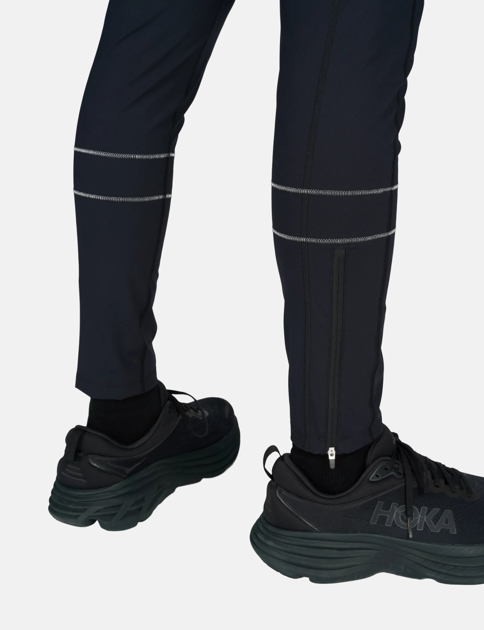 The waistband is adjustable and there are zippers at the ankles. The front leg displays the UNNA reflective logo while the back showcases the "Finish in a Good Place" manifesto. A side pocket is included for your phone.