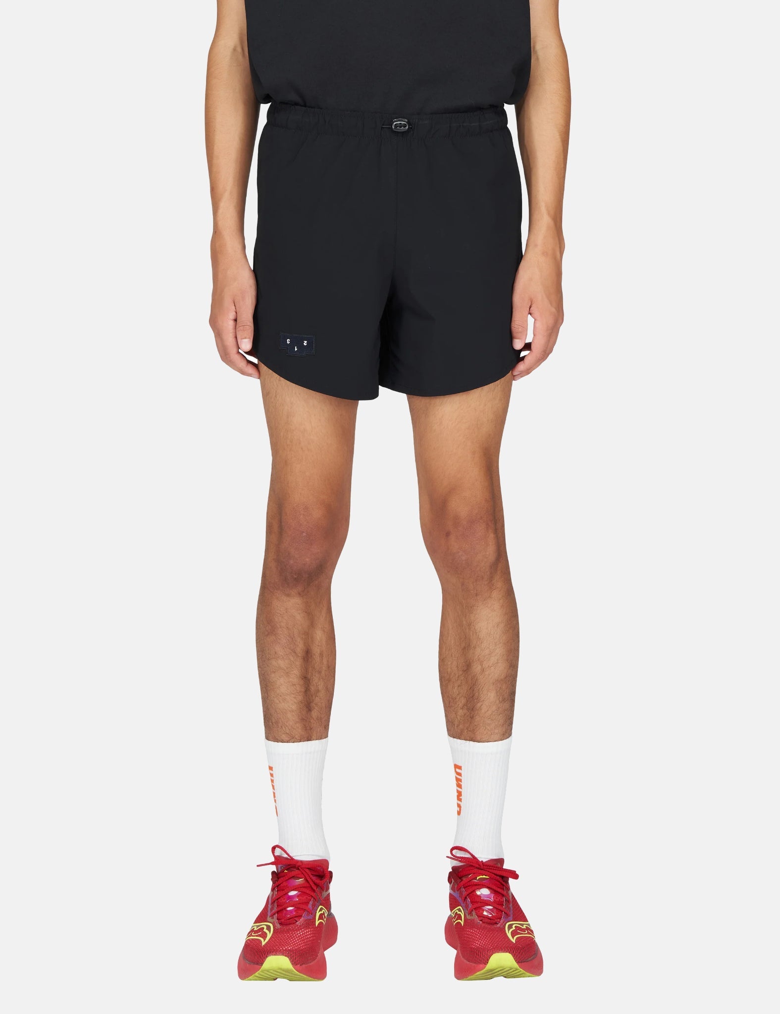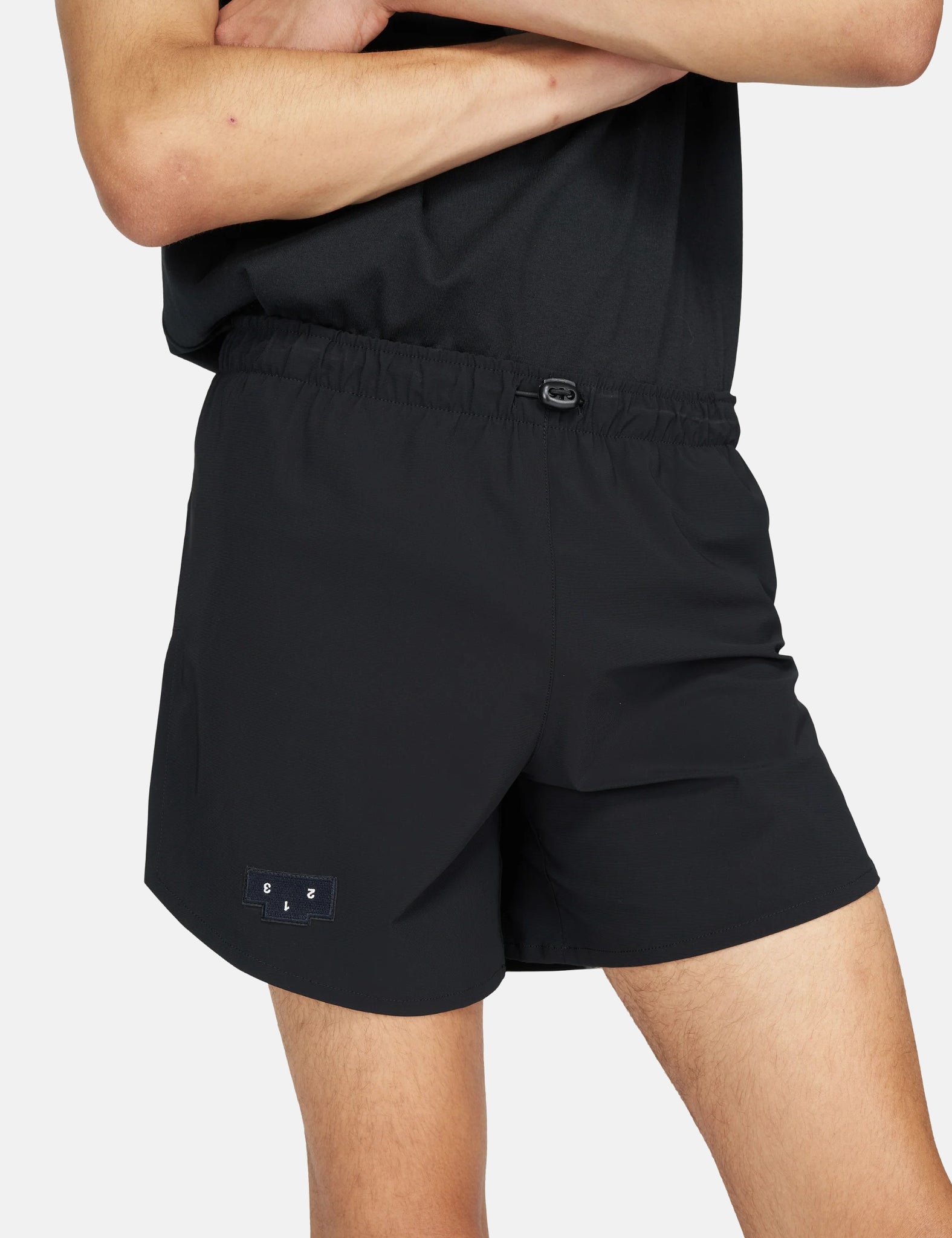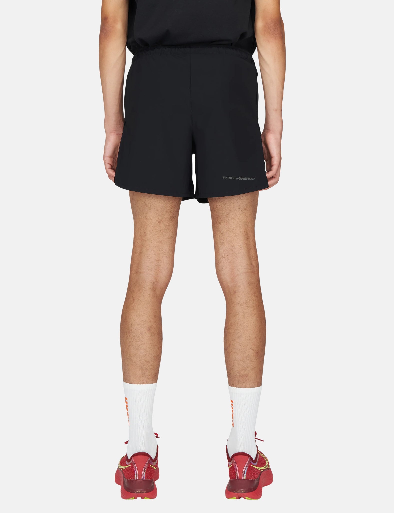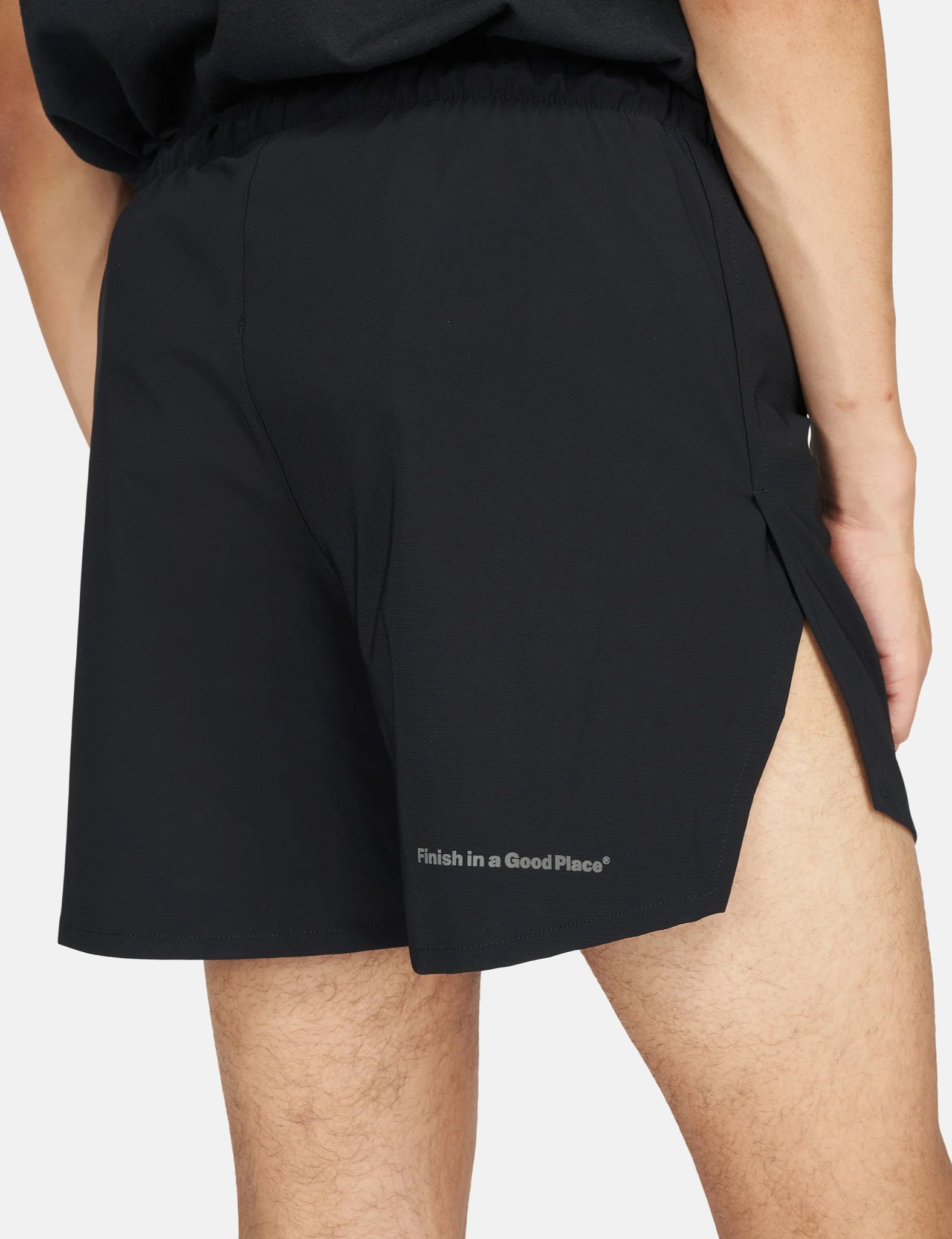 Meet UNNA's Tempo Shorts in black for men. These shorts feature a comfortable stretch and clever side vents. The front boasts our Podium Logo, while the back flaunts a reflective "Finish in a Good Place" slogan.