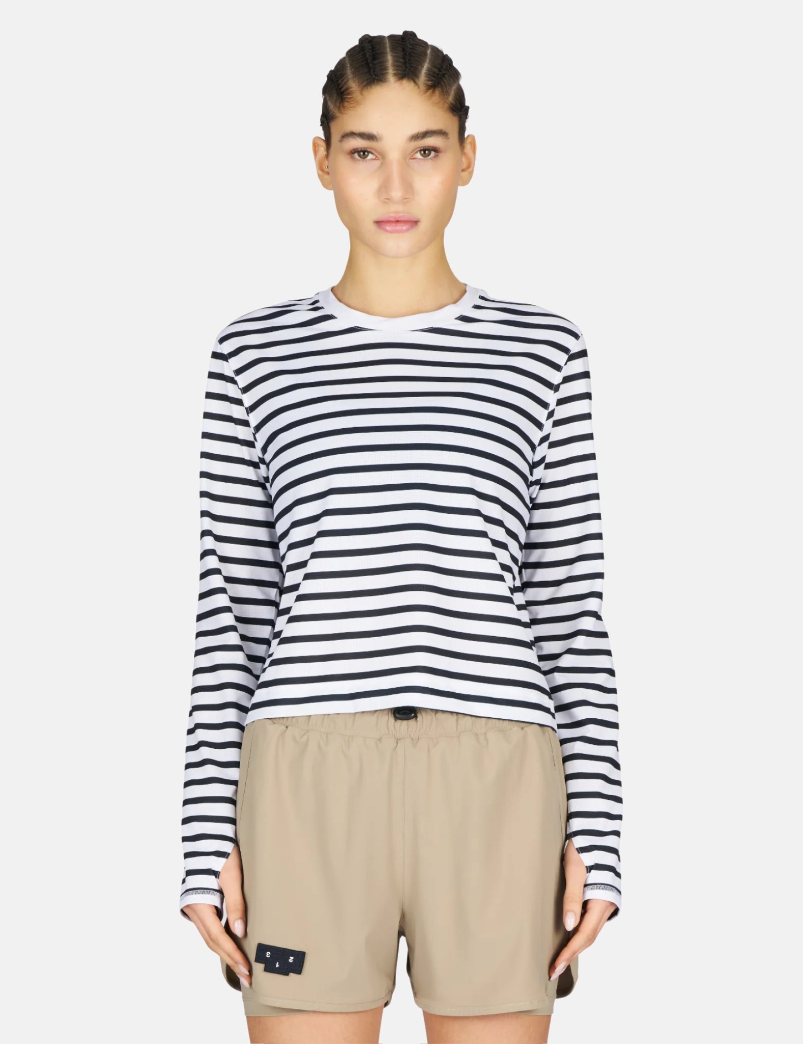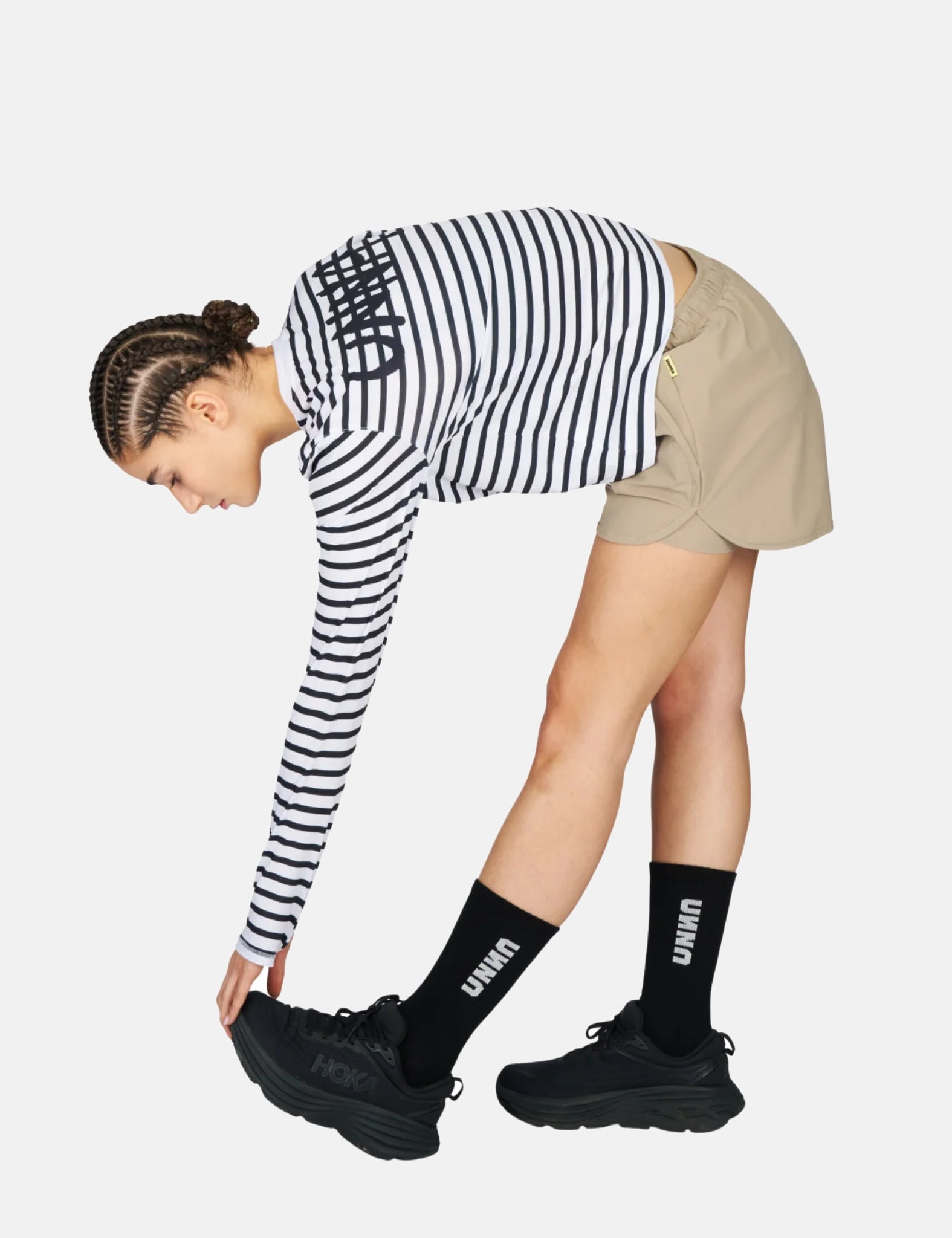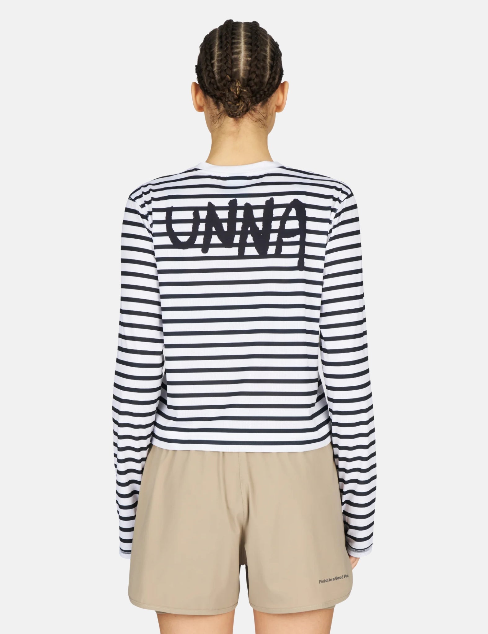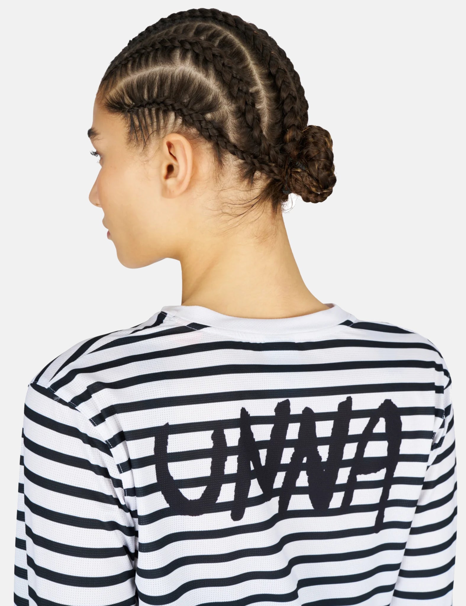 The UNNA women’s striped long sleeve Athletic tee in white and navy blue, with raglan sleeves and thumbholes. Made from fast-drying, post-consumer recycled polyester with a water-based sublimation-printed stripe design for stretch, breathability, and a funky UNNA logo on the back.